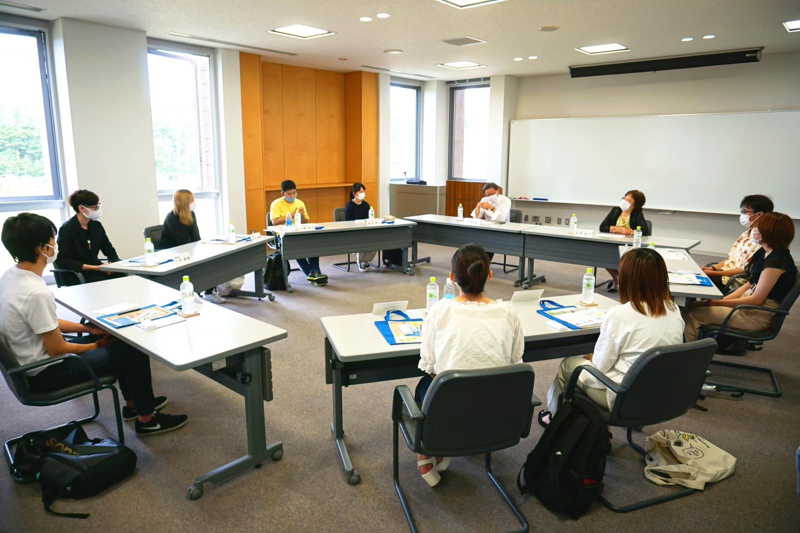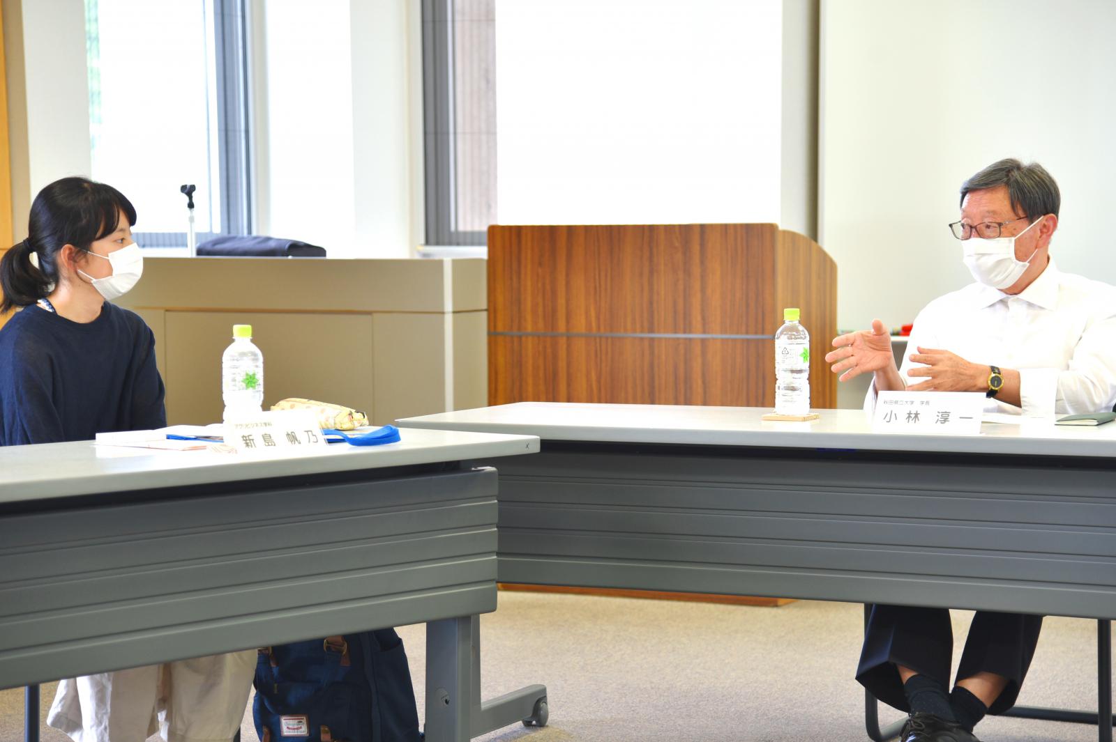 8月31日に、秋田キャンパスで、県大キャンパスミーティング(学生と学長との懇談会)が行われ、生物資源科学部の1年生9名と小林学長・吉澤副学長が懇談しました。(新型コロナウイルスへの感染防止に十分配慮し、開催しました。)参加者は、県大を志望した理由や近況について語り合い、今後の大学生活で期待することや大学に対する要望も挙げてもらいました。