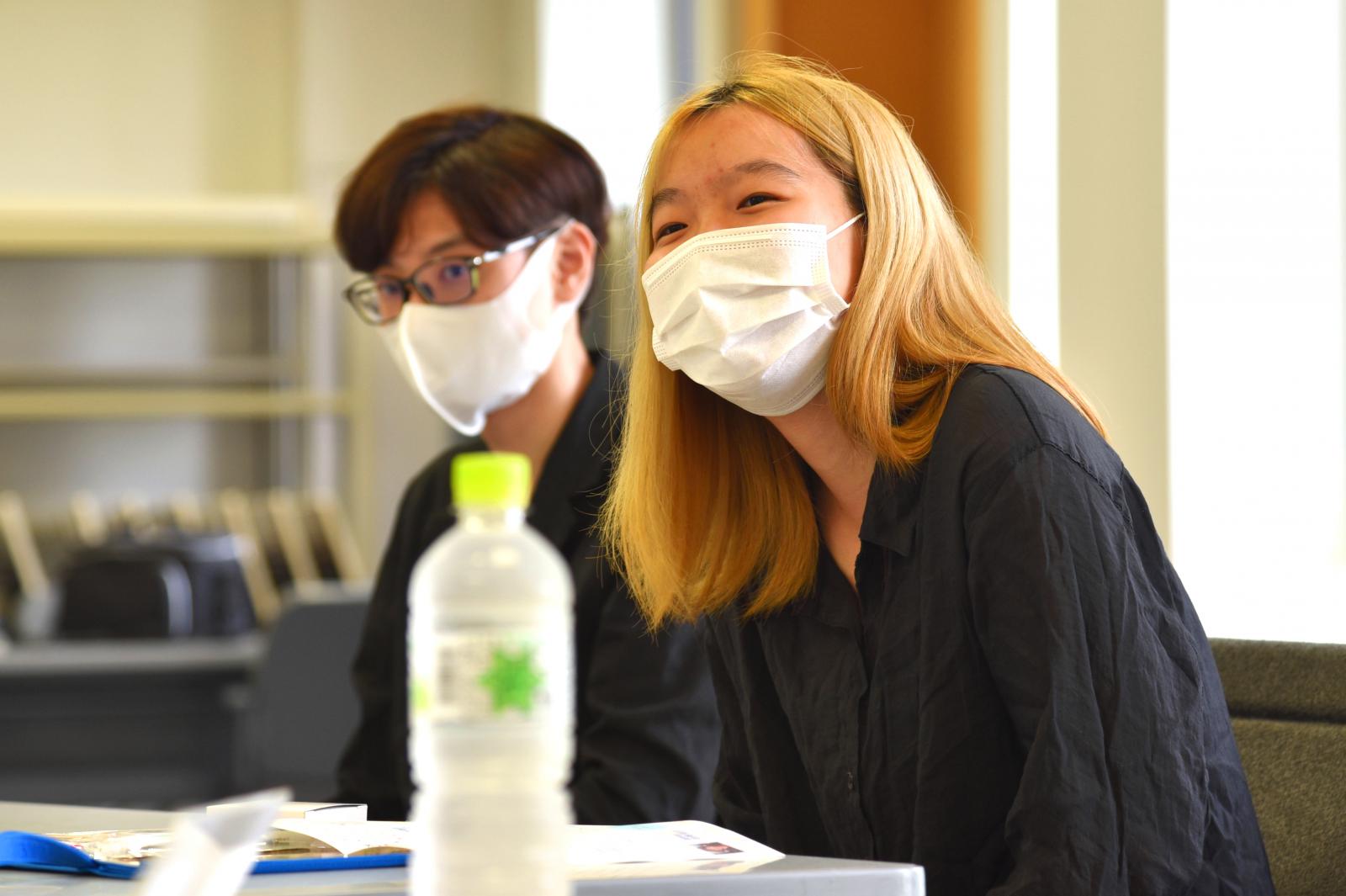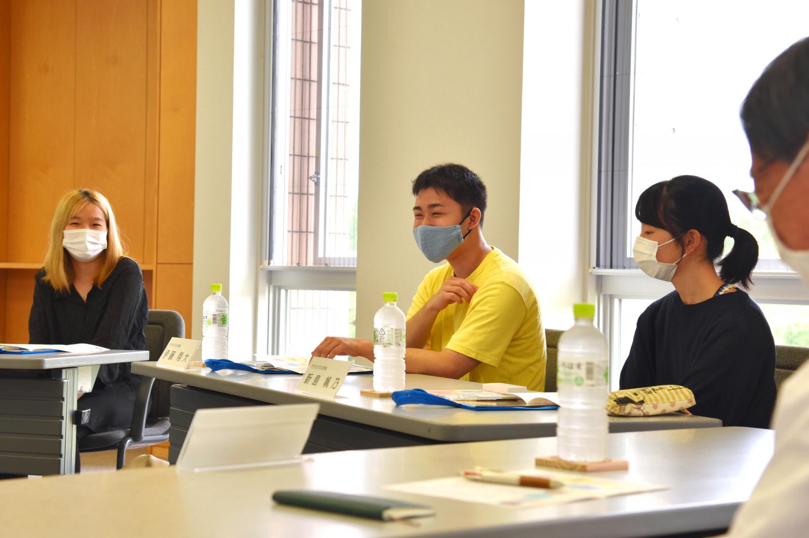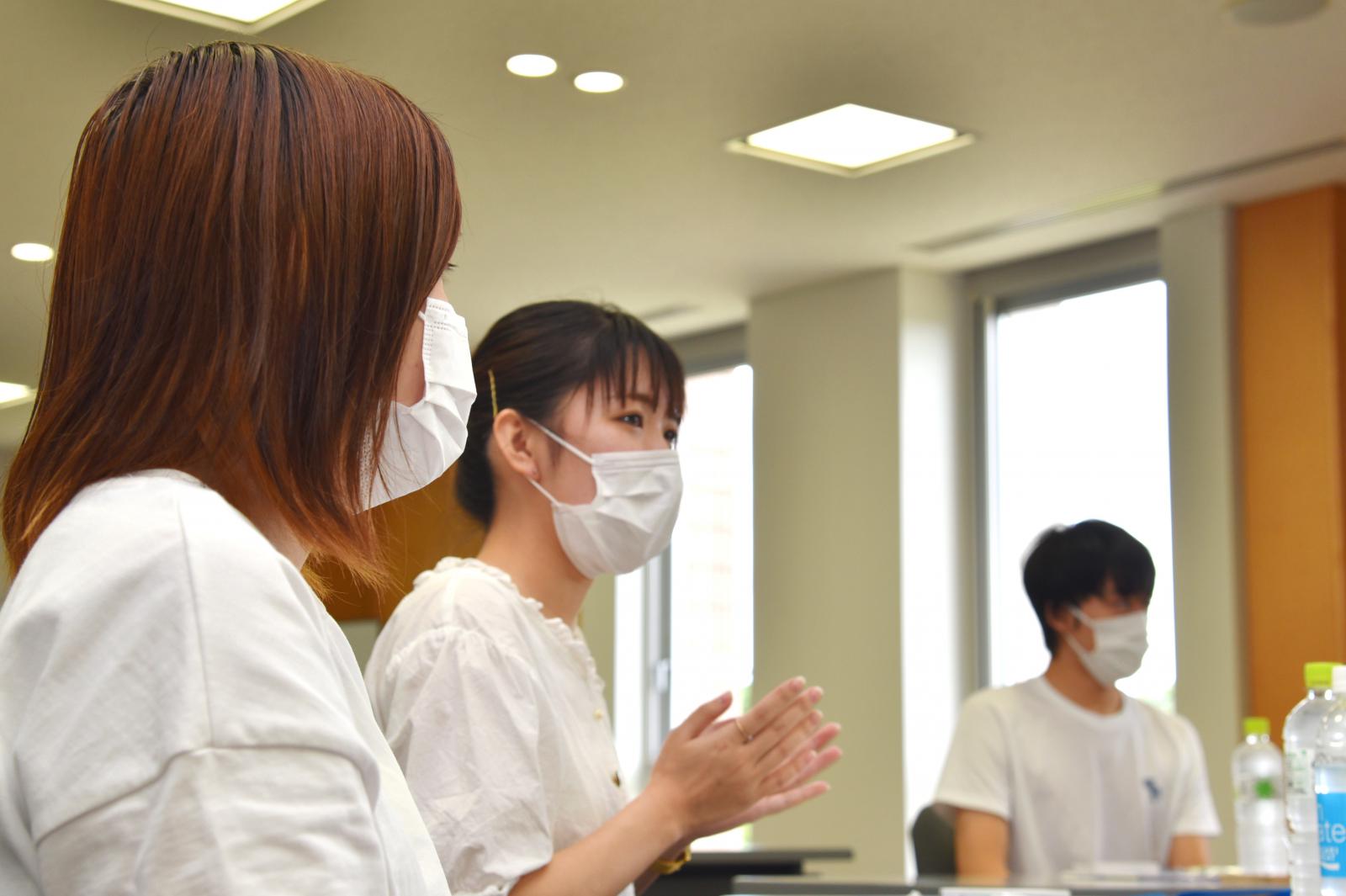 入学後、登校することがほとんどないままに始まった遠隔授業に関することが話題の中心となりました。パソコン操作が得意ではないので、通信が繋がらなかった時は一人で不安になったという意見や、学生同士でコミュニケーションを取るのが難しいという意見がありました。