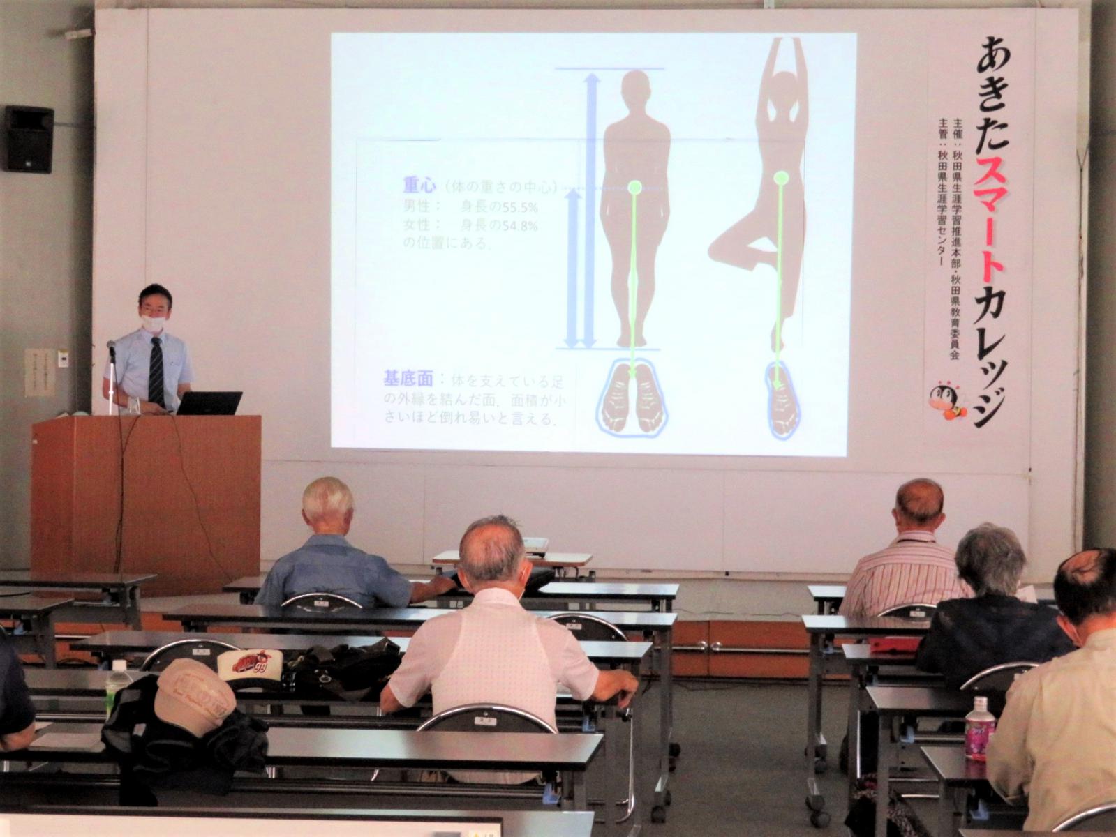 「あきたスマートカレッジ」は、県民の皆さま向けの総合的な生涯学習講座として秋田県が主催しているものです。内山准教授は、その中の「あきた教養講座 ~秋田のこれまで・秋田のこれから~」の一貫として、「転ばぬ先にできること ~生涯スポーツの立場から見る転倒予防~」のテーマで講師を務めました。