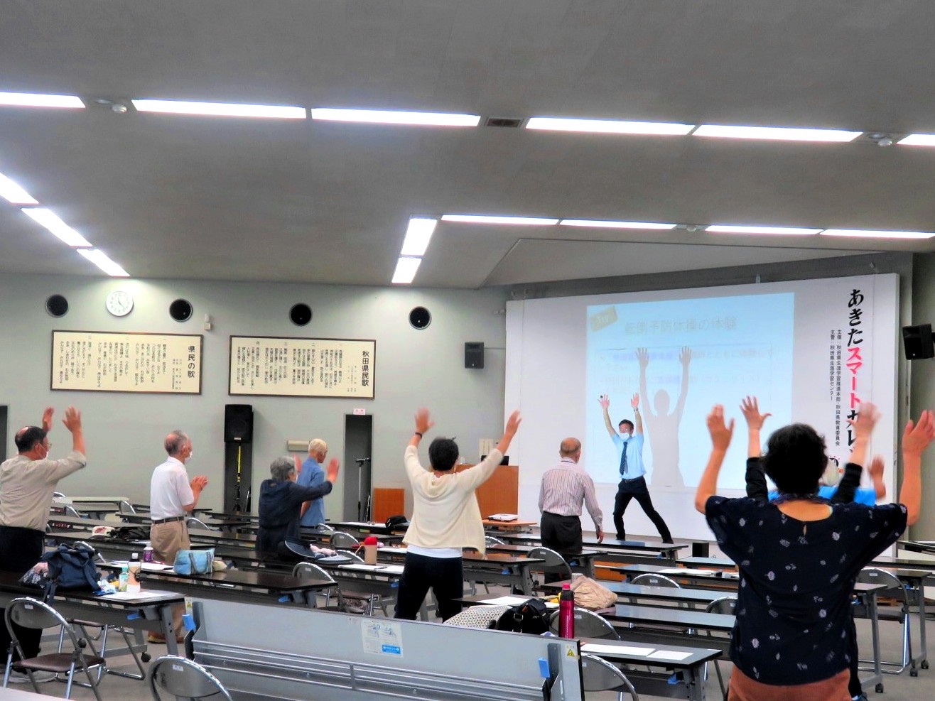 当日はコロナ禍にも関わらず多くの方にご参加いただき、受講者は高齢期における転倒予防に関する講義を受講した後、転倒予防のための「秋田音頭健康体操」や二重課題ステップを体験しました。終了後は「自分が運動を行っている意味を感じた」などのご感想をいただきました。