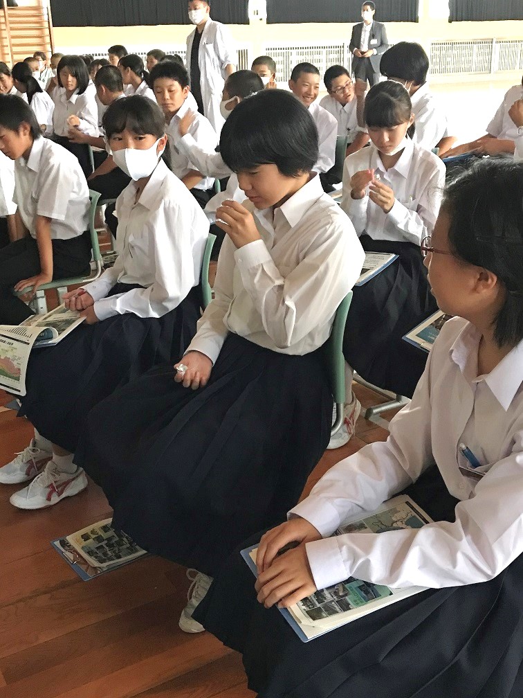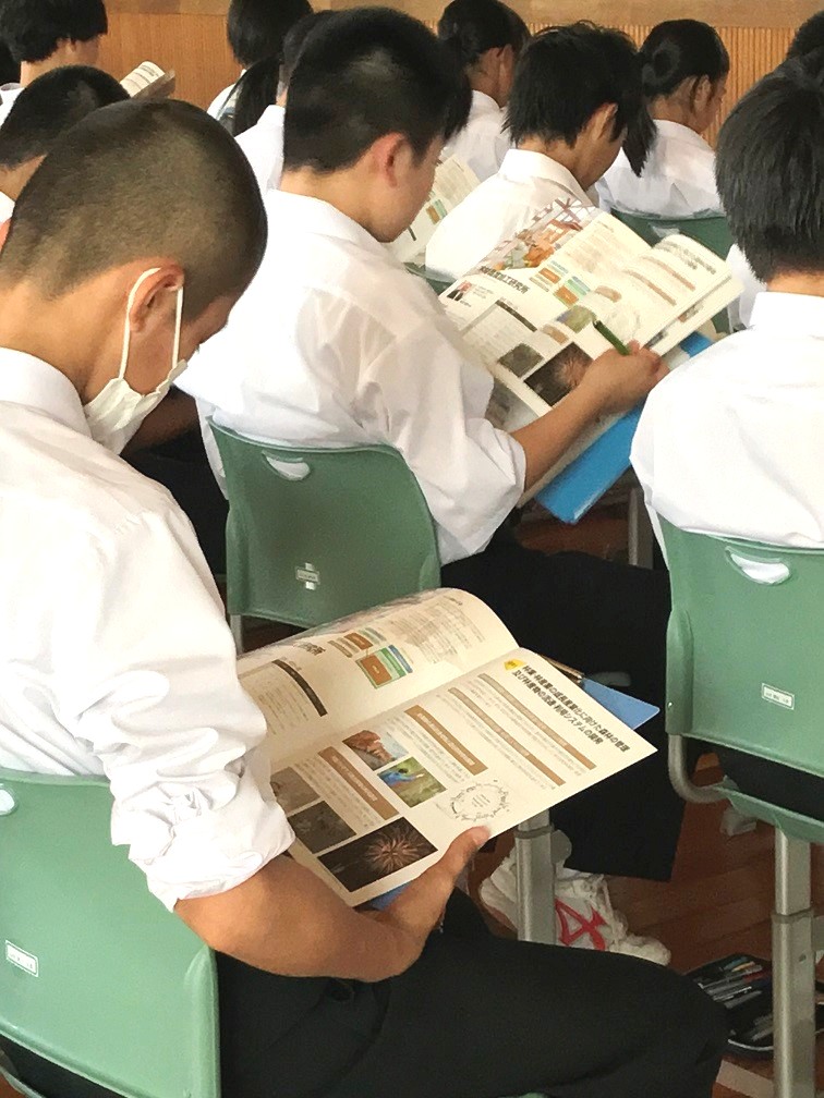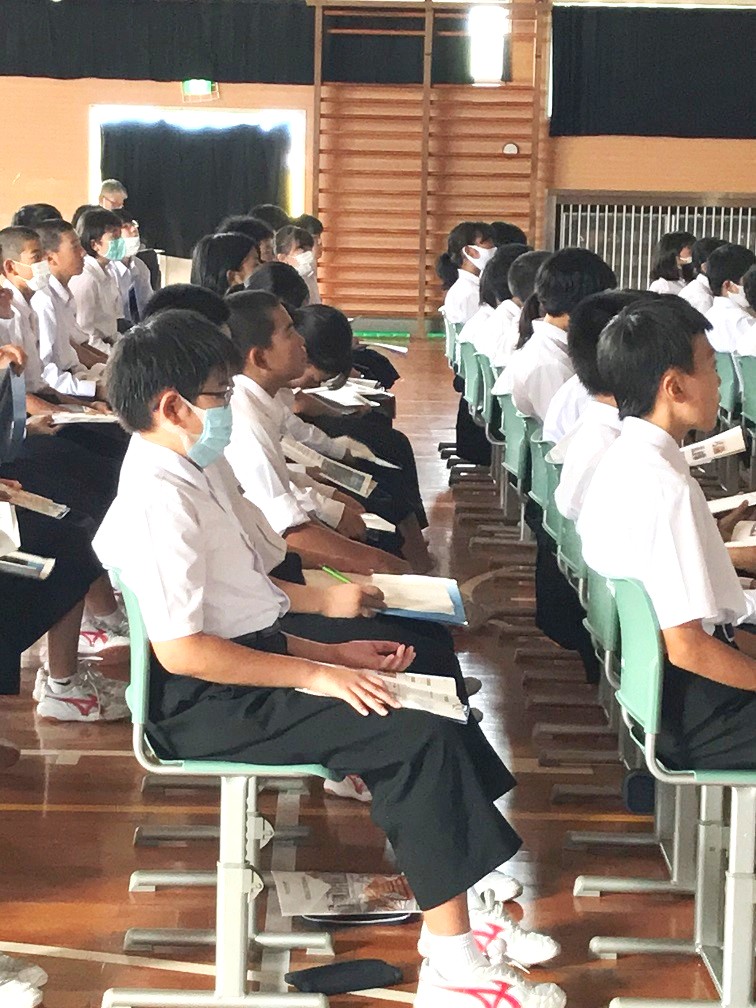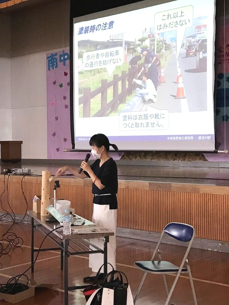 9月30日(火)に能代市で行われる「国道7号能代バイパス木製防護柵塗装イベント」について、当日ボランティアをしてくれる予定の能代南中学校1年生の皆さんに対し、木材高度加工研究所の渡辺千明准教授が事前授業を行いました。50分の授業では、当日のイベントで使用するペンキの塗り方や注意点だけではなく、秋田県や日本の森林資源の使われ方についてや、秋田スギを使ったまちづくりについてなども説明し、生徒たちは終始真剣に耳を傾けてくれました。