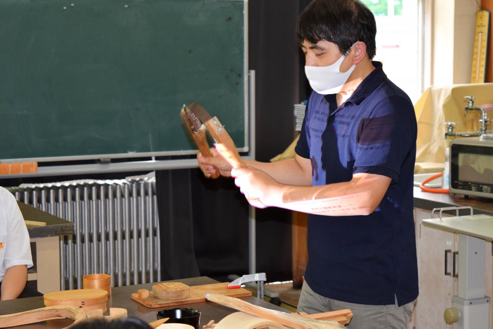 9月10日(木)、秋田県立湯沢高校において、本学木材高度加工研究所の足立幸司准教授による出前講座が開催されました。木材の性質や木材を利用する理由とその効果を学んだ後は、実際にセルロースナノファイバーや柔らかく加工した木材やバネのように伸縮する木材を手にとって観察し、木材加工(曲げ木)を体験しました。