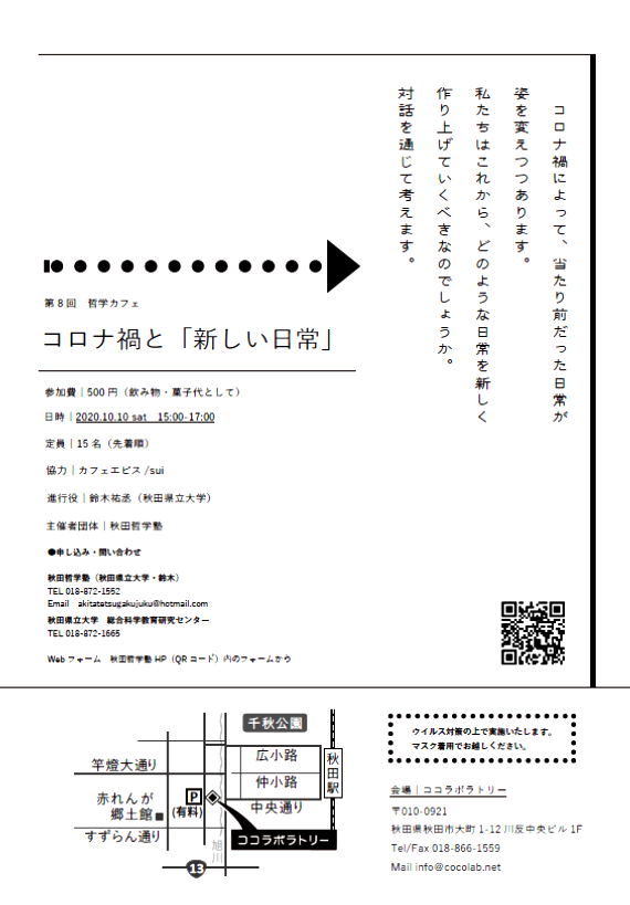 本学総合科学教育研究センターでは、哲学を通じた地域貢献活動として、「秋田哲学塾(代表:総合科学教育研究センター 鈴木 祐丞 助教)」を主催しております。その一環として、10月10日(土)、『コロナ禍と「新しい日常」』をテーマに、秋田市大町のココラボラトリーにおいて、哲学カフェを開催いたします。