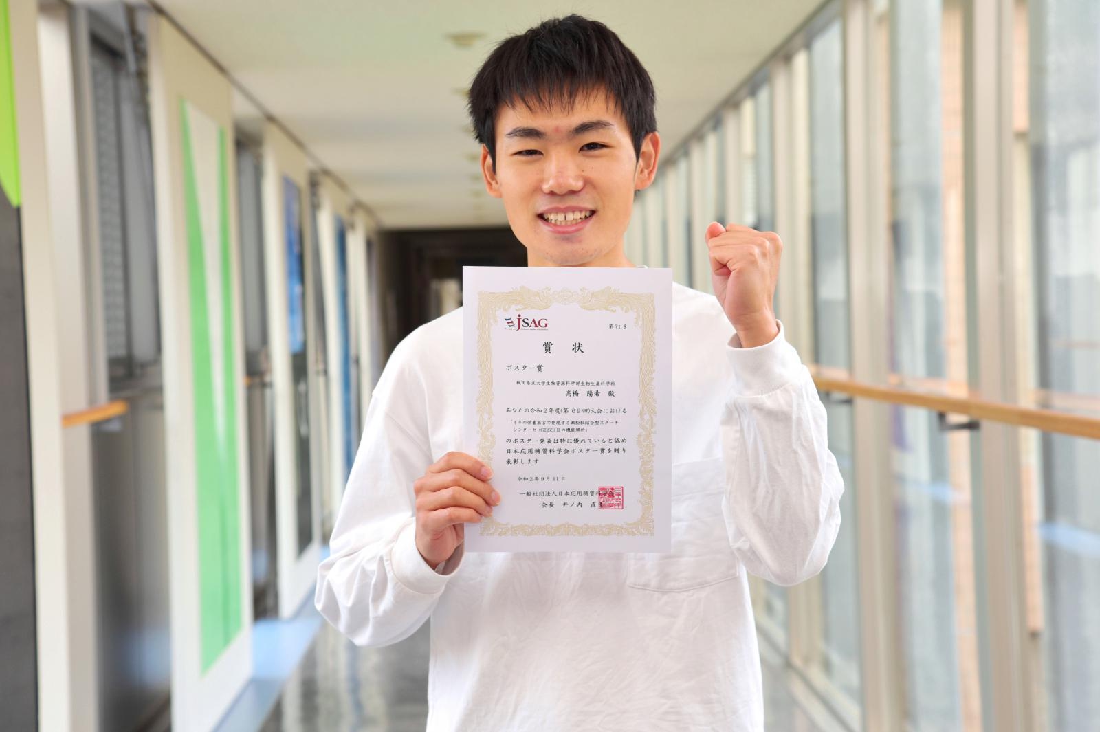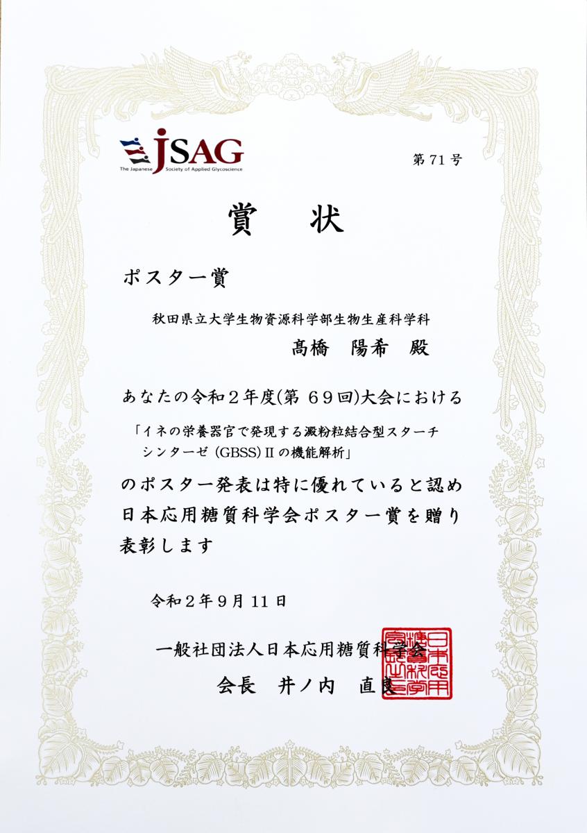 9月9日(水)から11日(金)にかけて開催された、日本応用糖質科学会2020年度大会_第69回(※オンラインで開催)において、生物資源科学部4年の高橋 陽希 さん(生物生産科学科/植物生理研究室)がポスター賞を受賞しました。高橋さんは、指導教員の藤田 直子 教授の指導の下、直向きに熱意を持ち続け、コツコツと研究に取り組んだ結果、本賞の受賞に繋がりました。★研究発表タイトル・発表者