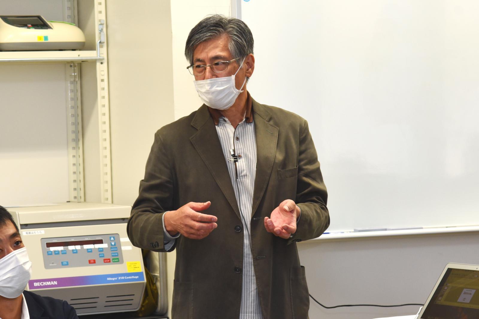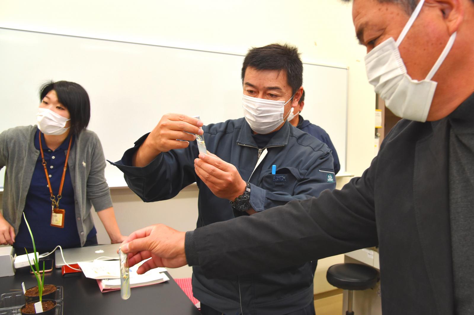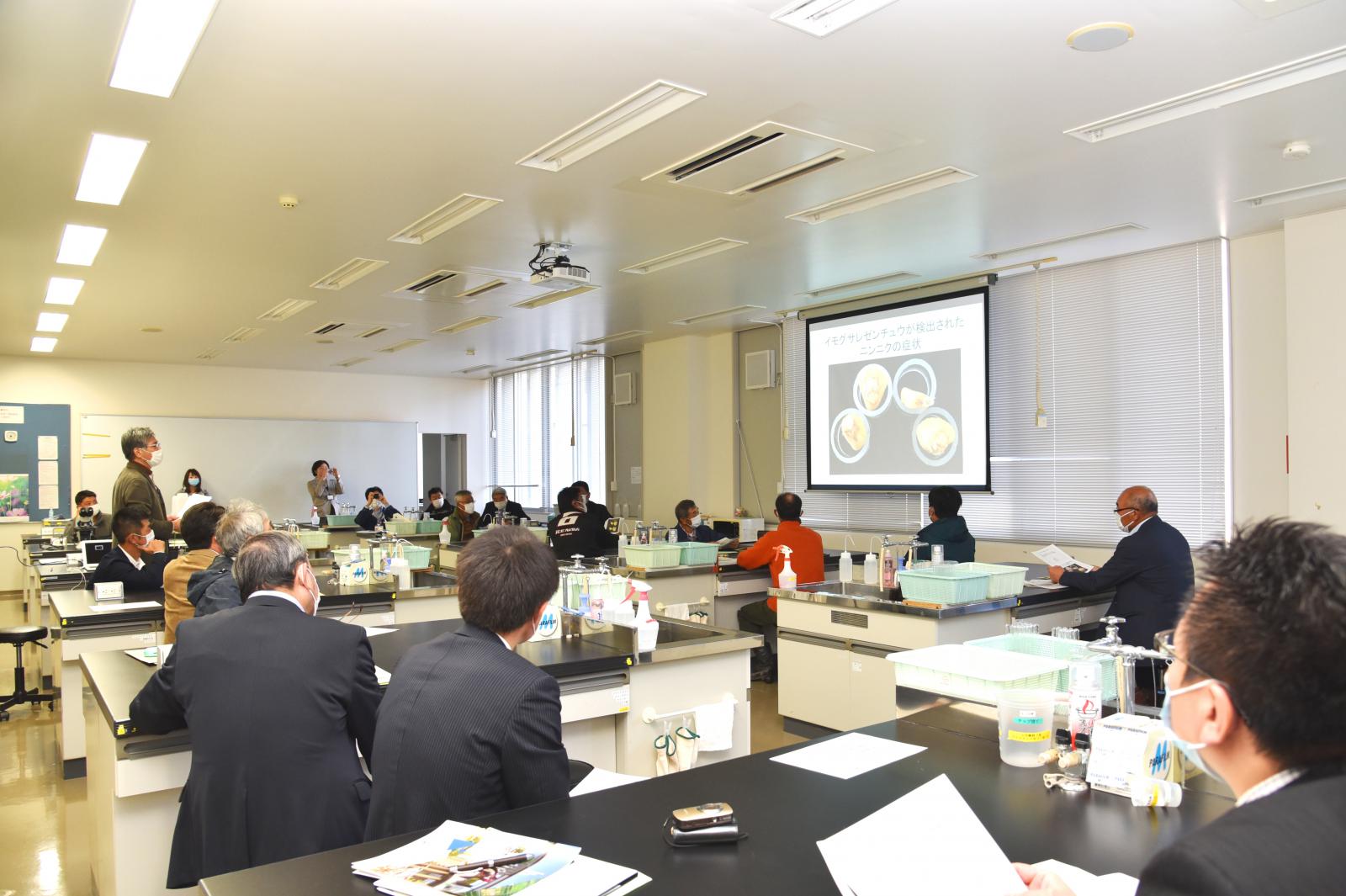 10月30日、秋田キャンパスにおいて、「秋田県にんにく生産者協議会」の視察研修が行われました。本学生物資源科学部では、平成30年度よりにんにくの品質維持や生産量の増加、更には産地化に向けた取り組みをサポートしており、今回は、古屋 廣光 特別研究員から「イモグサレセンチュウ(※)の進入防止対策」について、生物生産科学科の川上 寛子 助教から「地元優良種子のウイルスフリー化」について、それぞれ研究成果の紹介を行いました。また、研究発表の後には、生物生産科学科の戸田 武 准教授も交えての討論・情報交換も行いました。