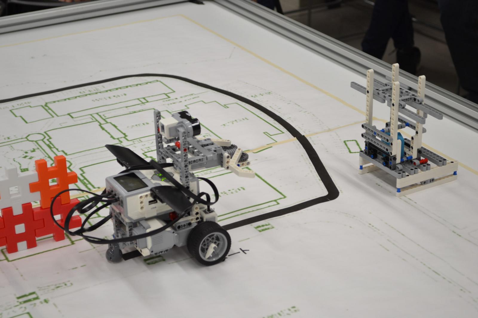 今回は本荘キャンパスを想定した競技フィールドで雪下ろし作業を行う、ライントレースロボットを作製しています。昨年度最終課題では屋根模型から雪に見立てたブロックを下ろし、雪捨て場へ運ぶ作業を行いましたが、今年度は難易度を上げ、雪捨て場への移動の際「雪ブロックを持ち上げて運ぶ」ルールが追加されました。