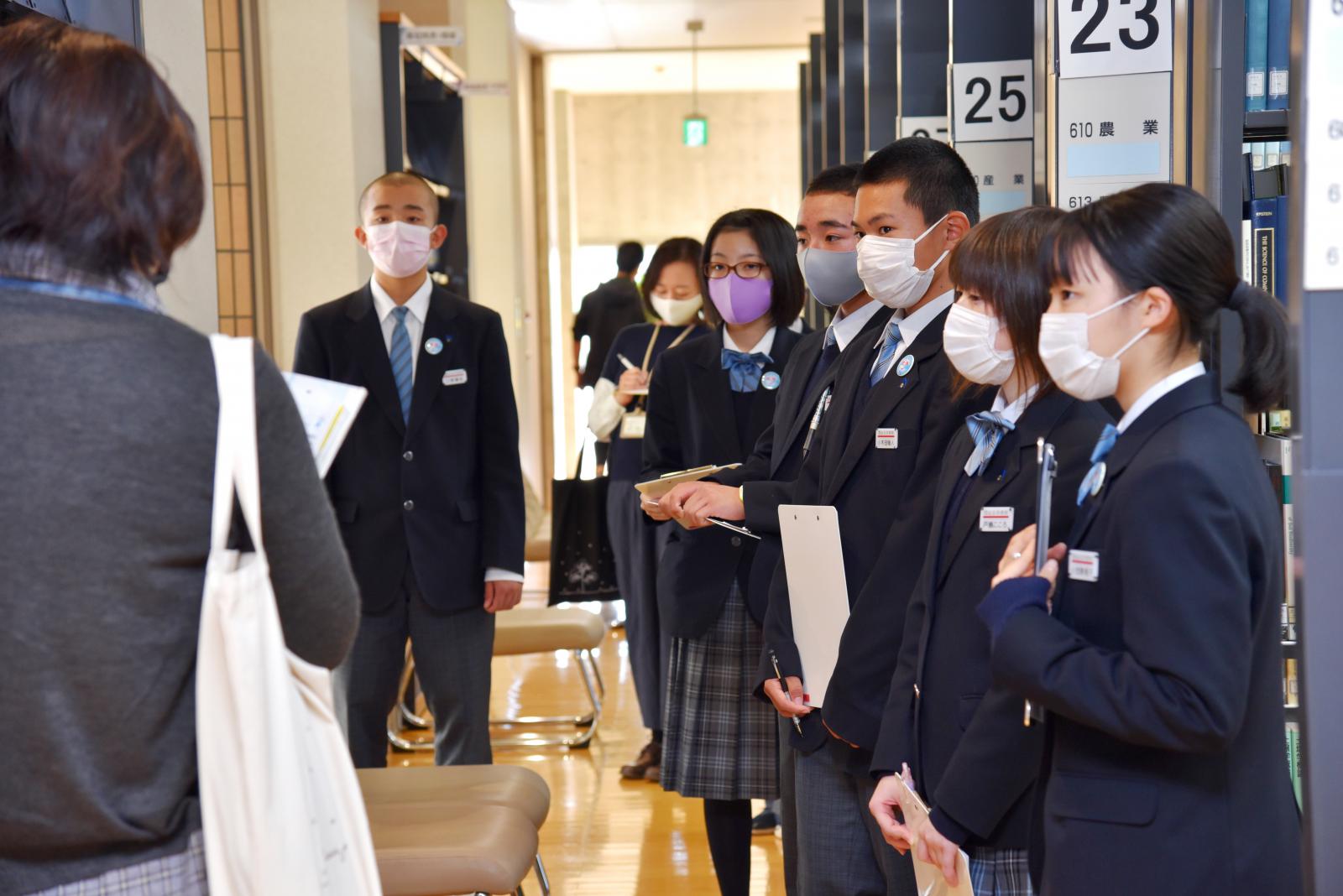 その後の施設見学では、学生自主研究のパネル展示のほか、学生ホール、講堂、図書館といった本学の特長的な施設をじっくり見ていただきました。