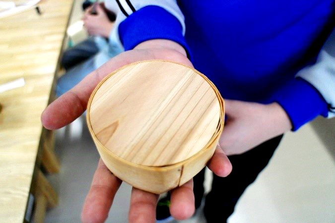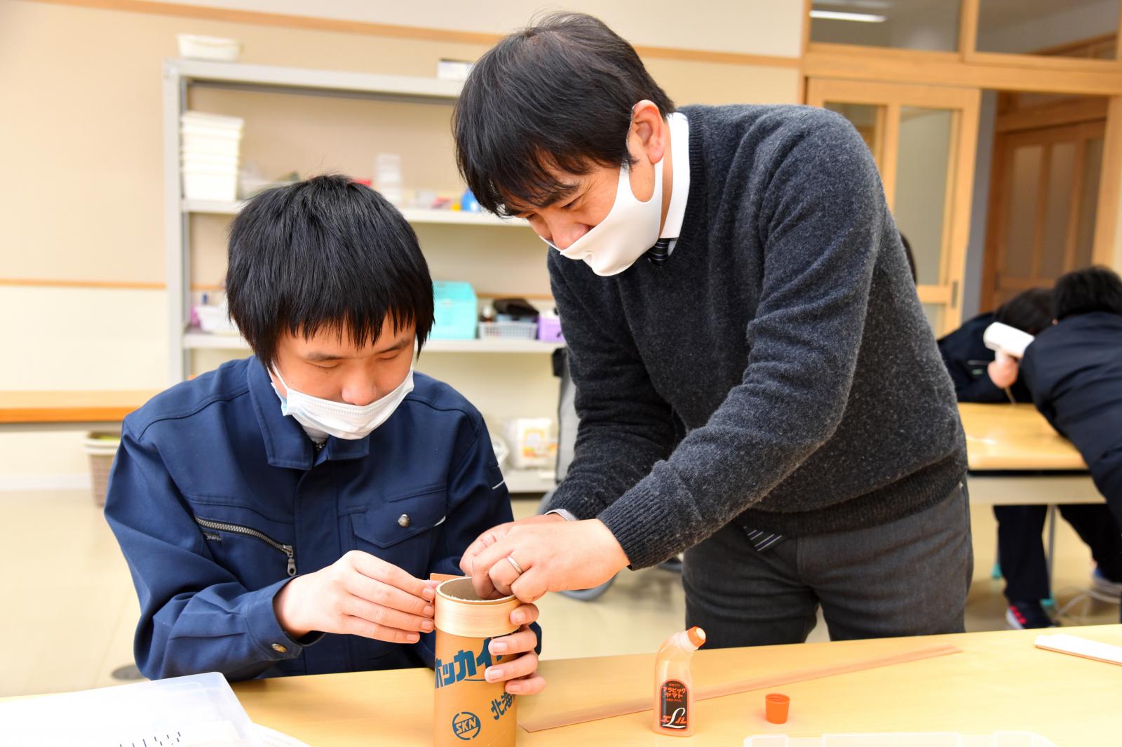 出来映えは見事なもので、生徒さんから「板を曲げてのり付けするところが難しかったけど、出来上がりに満足した。」、「筒をもっと薄くして中に電球を組み込んでランプにしてみたい。」などの感想をいただきました。