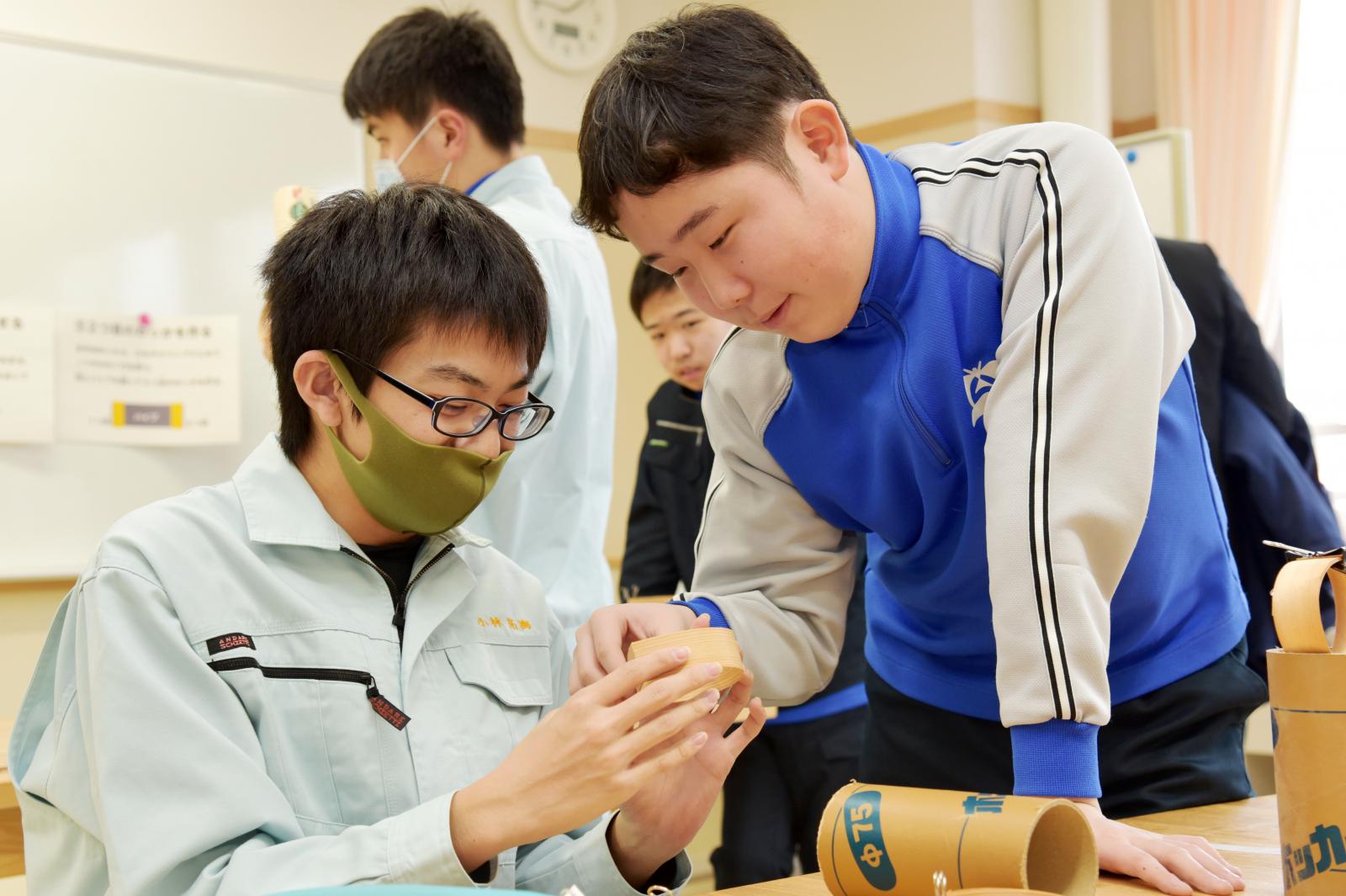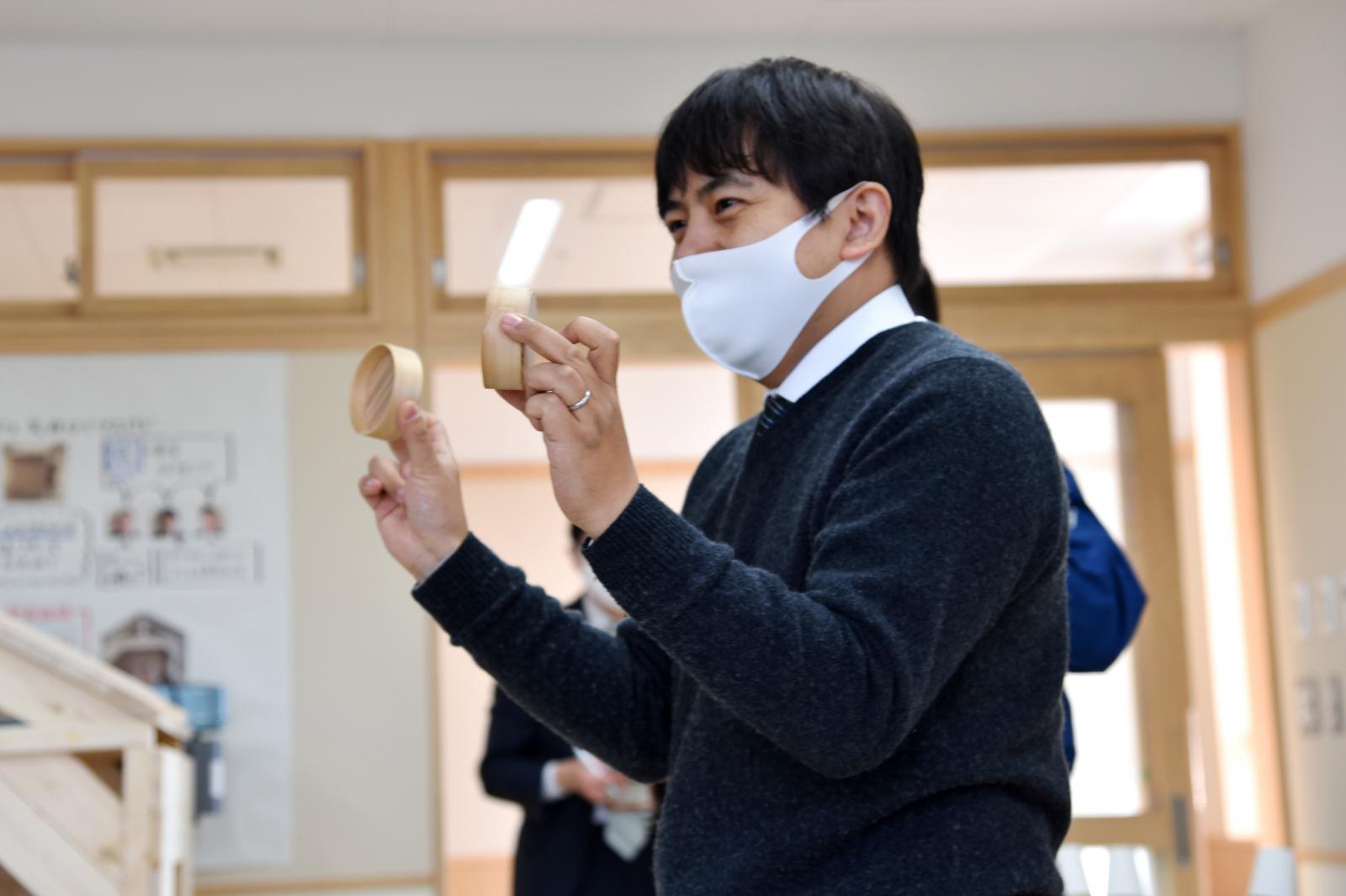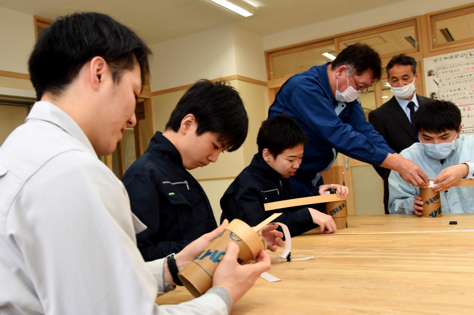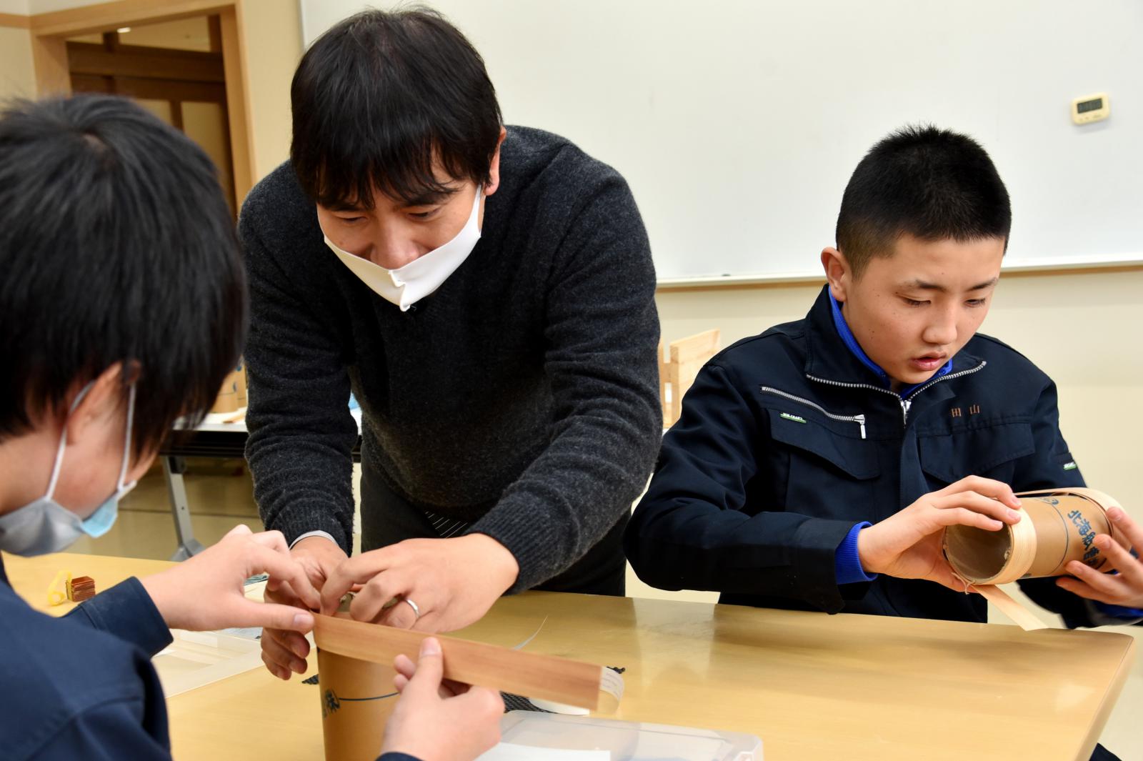 令和2年12月11日(金)大館市の秋田県立比内支援学校において、本学木材高度加工研究所の足立 幸司准教授と藤嶋 聖人職員による出前講座が開催されました。講座は中学部と高等部の生徒12人を対象に、地域の特色を活かした曲げわっぱネームプレートの製作を行いました。