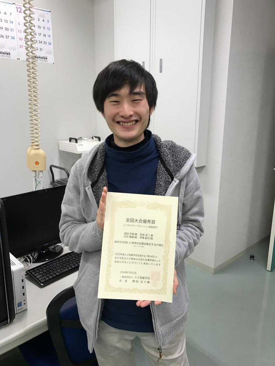 システム科学技術研究科電子情報システム学専攻1年生の福田芳樹さんが、2020年6月9日〜6月12日に開催された2020年度 人工知能学会全国大会 (第34回) インタラクティブセッション発表部門にて研究発表を行い、全国大会優秀賞を受賞しました。講演タイトルは下記のとおりでした。