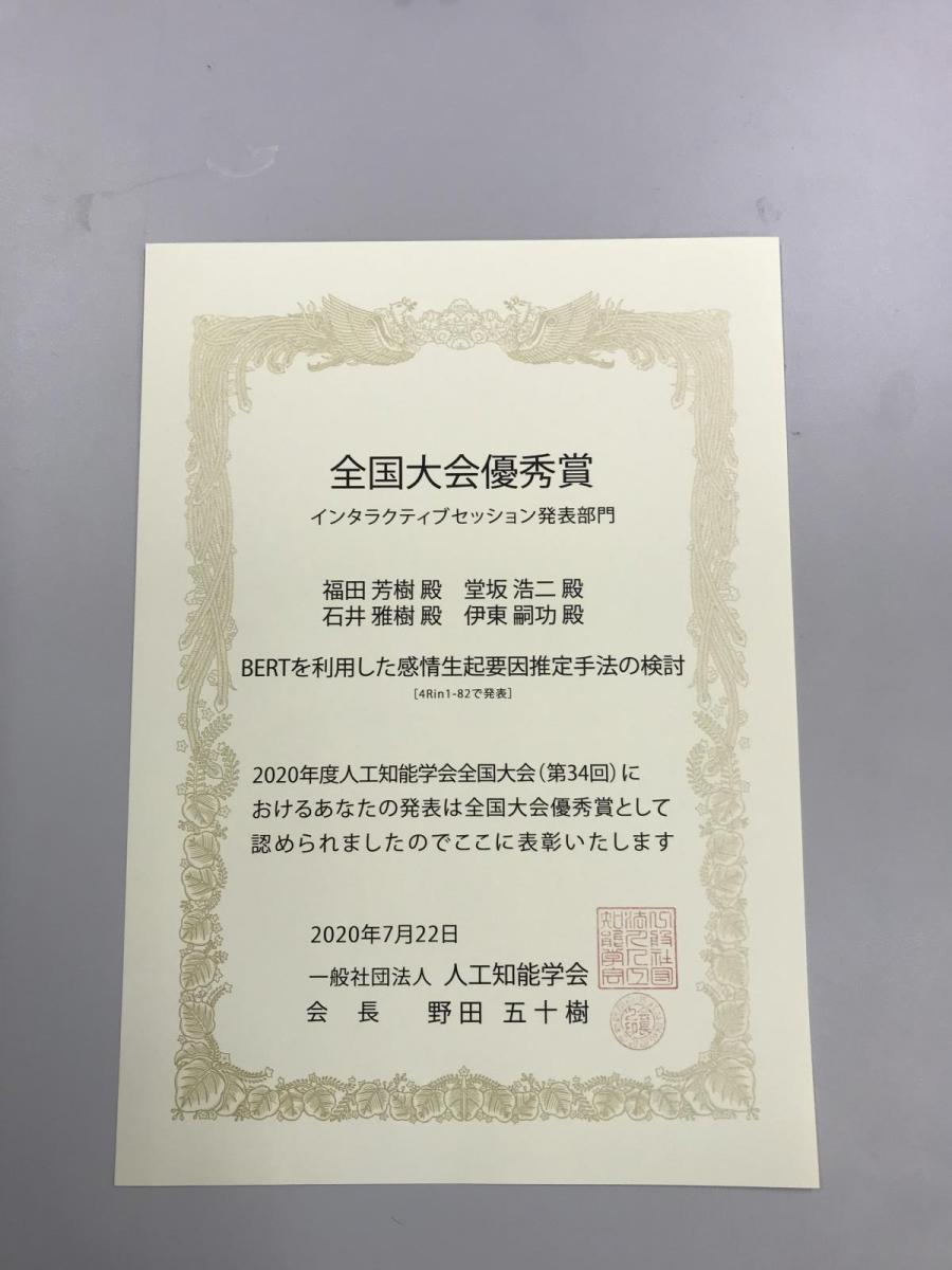 この度は2020年度 人工知能学会全国大会 (第34回) インタラクティブセッション発表部門 全国大会優秀賞という大変素晴らしい賞を頂戴し光栄に思います。これもひとえに研究室配属以来多くの先生、先輩方にご指導をいただけたおかげと存じます。本研究に携わった皆様に、この場をお借りしてお礼申し上げます。