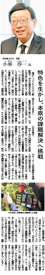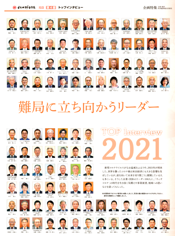秋田魁新報「トップインタビュー」に小林学長のインタビュー記事が掲載されました 2021年1月1日付けの、秋田魁新報「トップインタビュー2021」において、小林淳一学長のインタビュー記事が掲載されました。 内容は秋田魁新報電子版からもご覧いただけますので、是非ご覧ください。 秋田魁新報電子版 小林学長のインタビュー記事