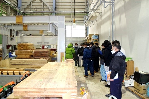秋田林業大学校の皆さんは日頃、森林や林業、木材産業に関する幅広い知識と技術を学んでおられますので、担当した木材高度加工研究所の高田 克彦 所長と熱心なやり取りが行われ、興味津々に説明に聞き入っておりました。