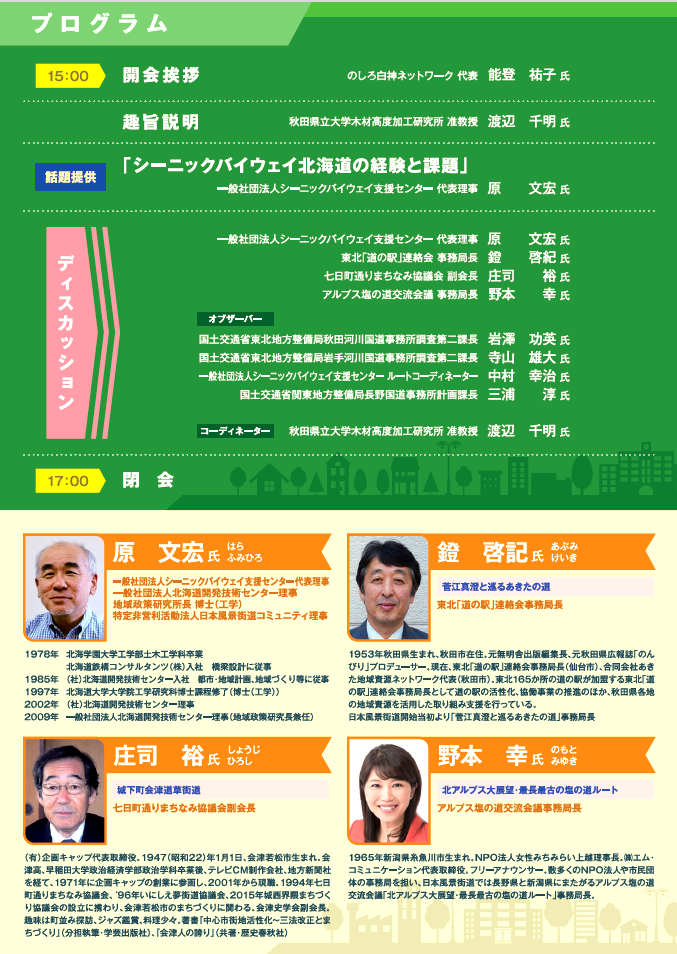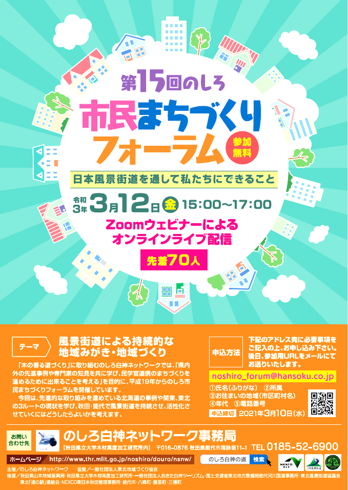 3月12日(金)、「のしろ白神ネットワーク(事務局:木材高度加工研究所)」が主催し、本学が後援する『第15回のしろ市民まちづくりフォーラム~日本風景街道を通して私たちにできること~』が、オンラインによるライブ配信(Zoomウェビナー)で開催されます。今回のフォーラムは、「風景街道による地域みがきと地域づくり」をテーマに、日本の風景街道と道の駅が連携する北海道の先進事例「シーニックバイウェイ北海道」の話題提供や、木材高度加工研究所の渡辺千明 准教授がコーディネーターを務めるディスカッションでは、関東、東北の3ルートの現状を学び、秋田・能代で風景街道を持続させ、魅力ある地域づくりを進めるための課題・解決に向けて議論を深めます。