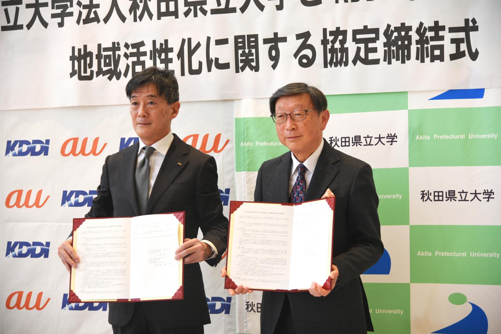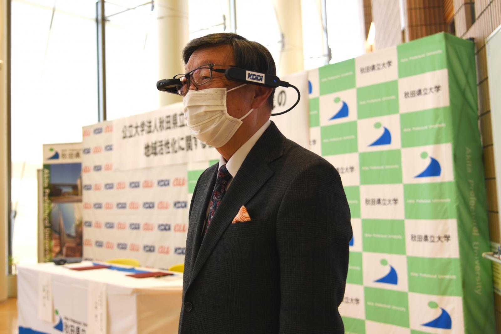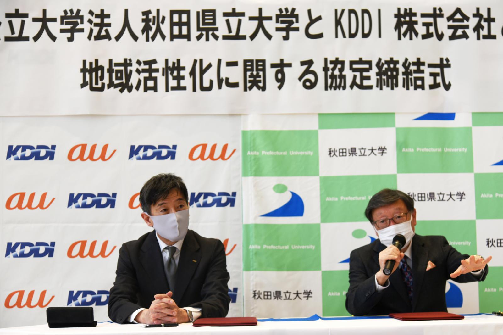 KDDIと地域活性化に関する協定を締結しました 3月22日、KDDI 株式会社 (髙橋 誠 代表取締役社長 )と本学(小林 淳一 理事長)は、秋田県の農業における課題解決や、大学における農業研究及び人材育成の推進を目指し、連携協定を締結しました。 詳細は、以下のプレスリリースをご覧ください。 【プレスリリース】KDDIと地域活性化に関する協定を締結しました(令和3年3月22日発表) ★協定式の様子/ウェアラブルカメラによる遠隔操作の様子