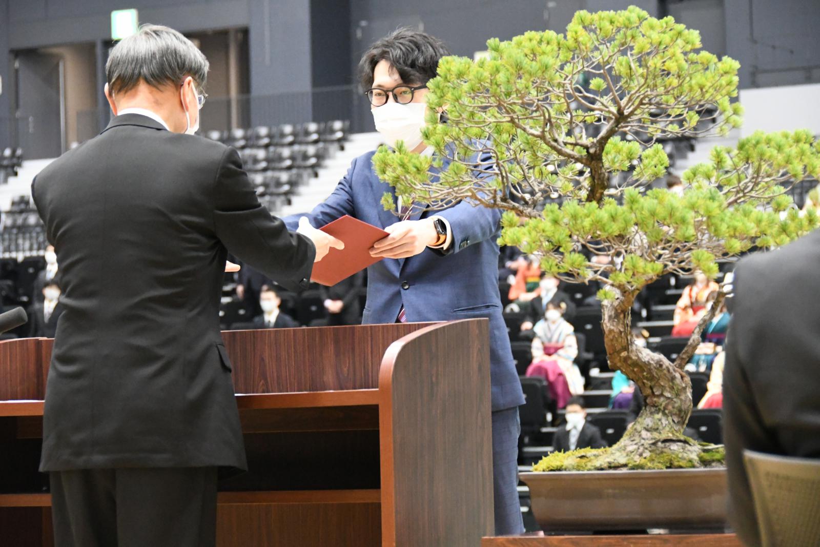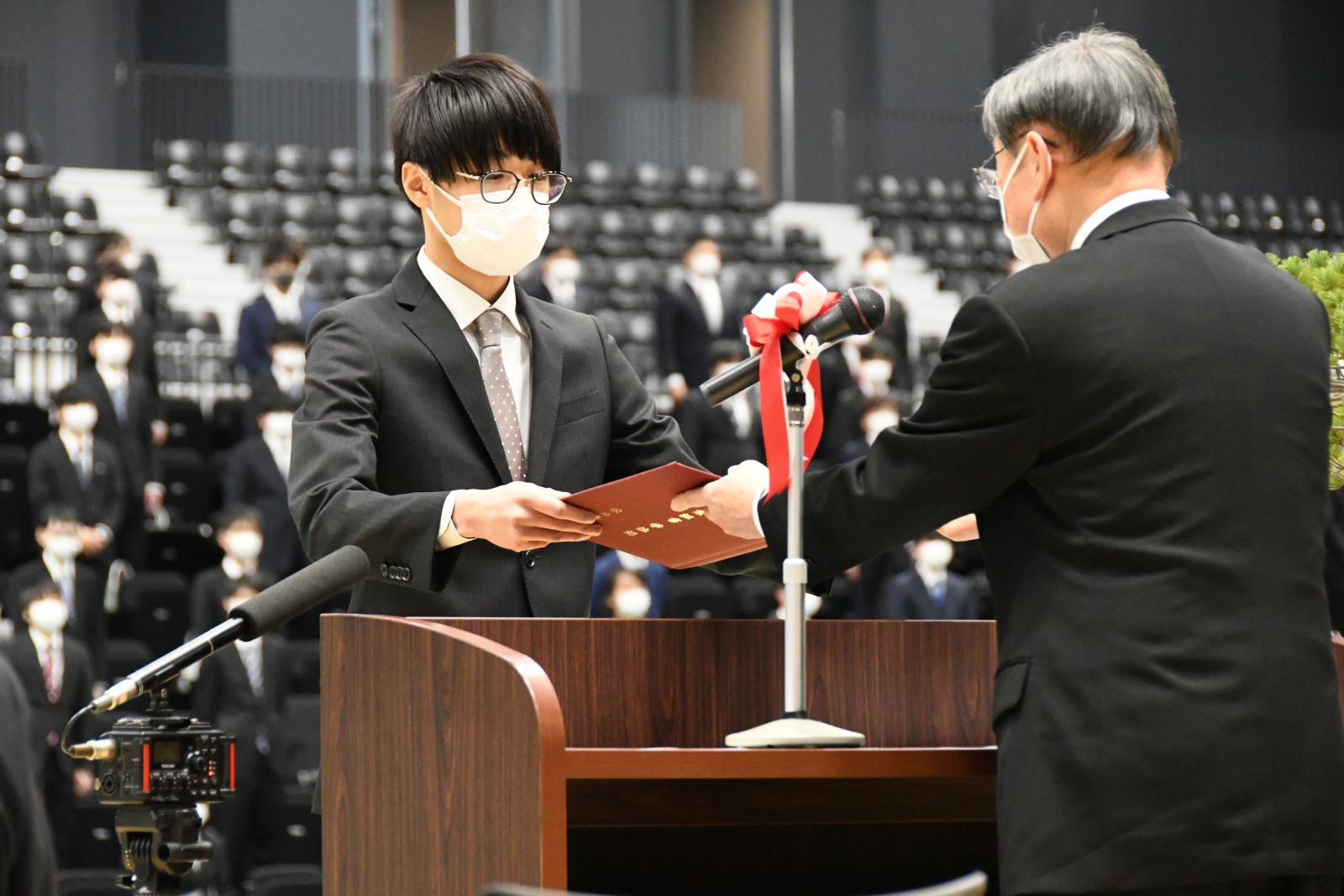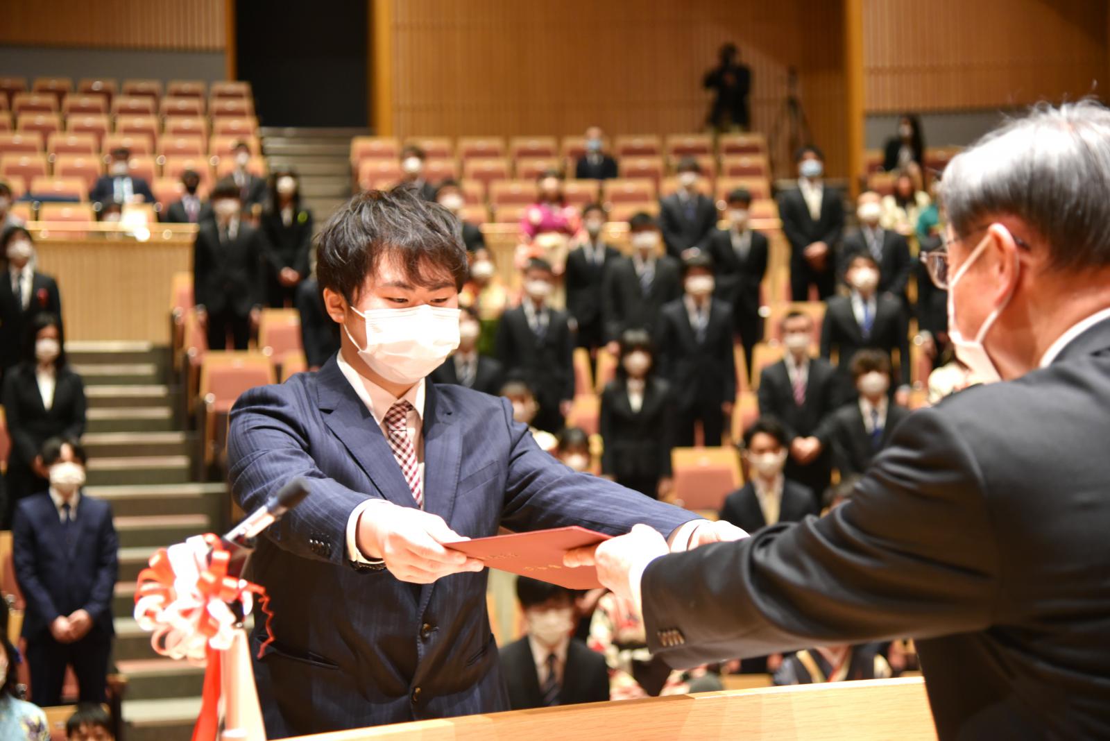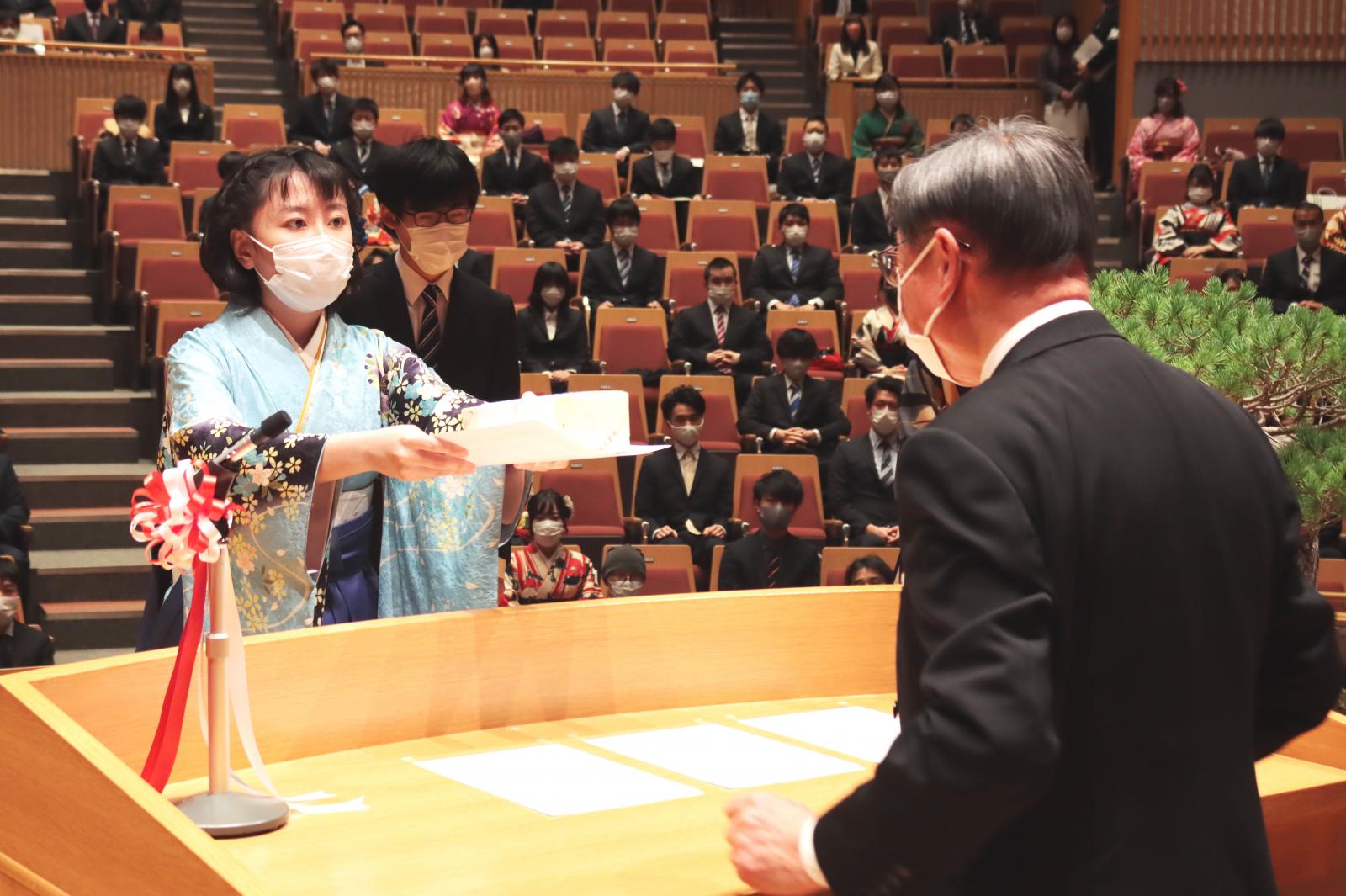本学では、昨年度の卒業式・修了式は中止となりましたが、本年度は式典会場を学部・研究科ごとに2会場に分散し、式への参加対象を卒業生・修了生のみに限定するなど、新型コロナウイルス感染症防止対策を講じながら挙行いたしました。式では、学生の代表が小林淳一学長から学位記や修了証書を受け取りました。