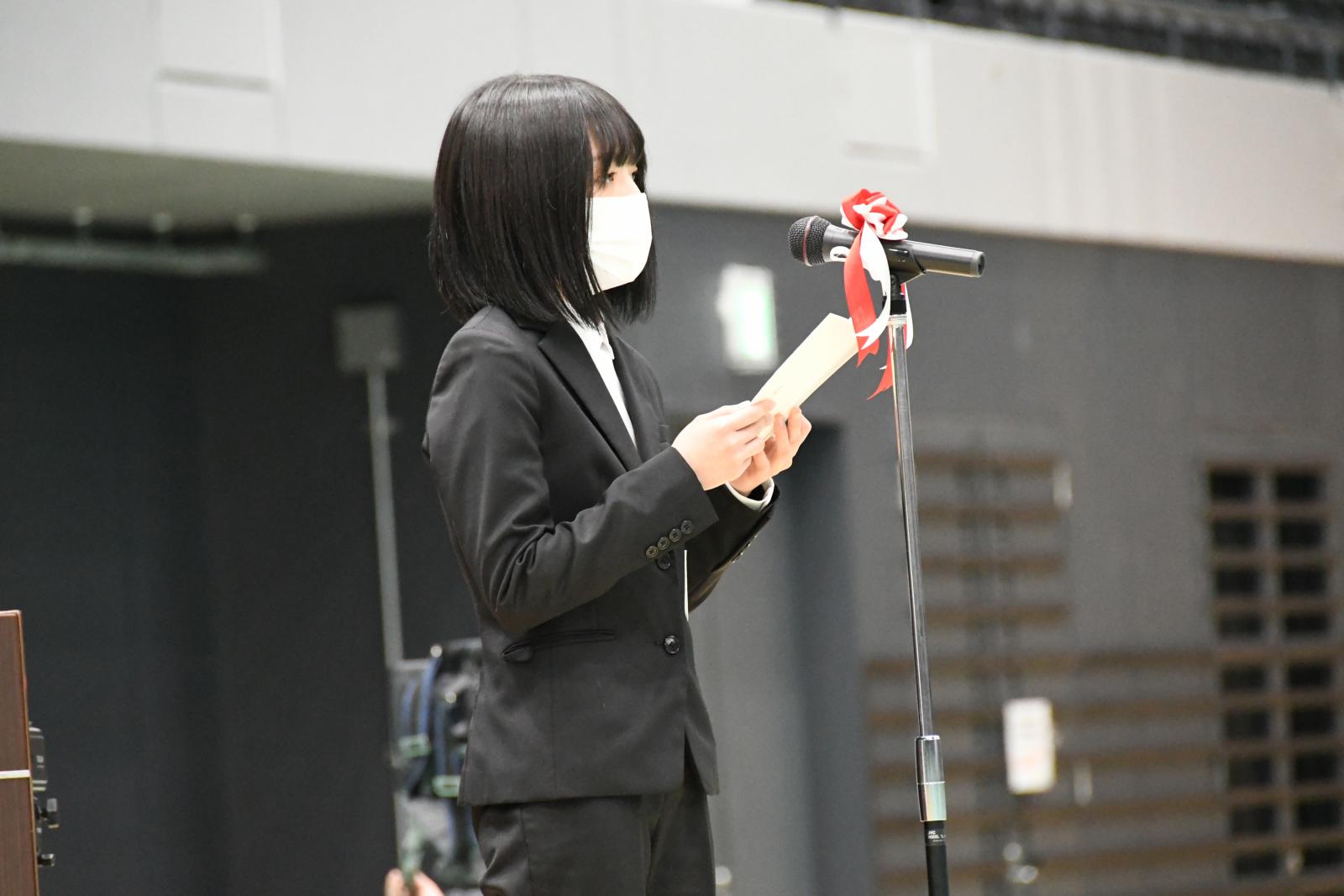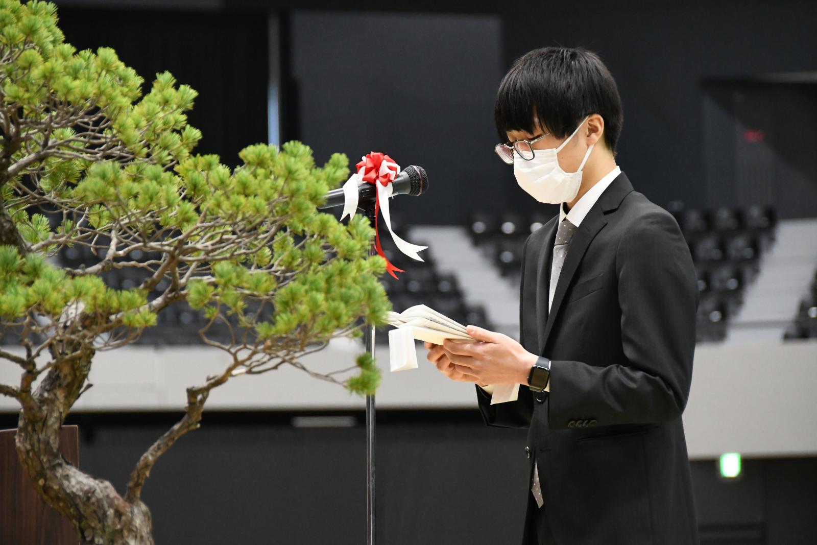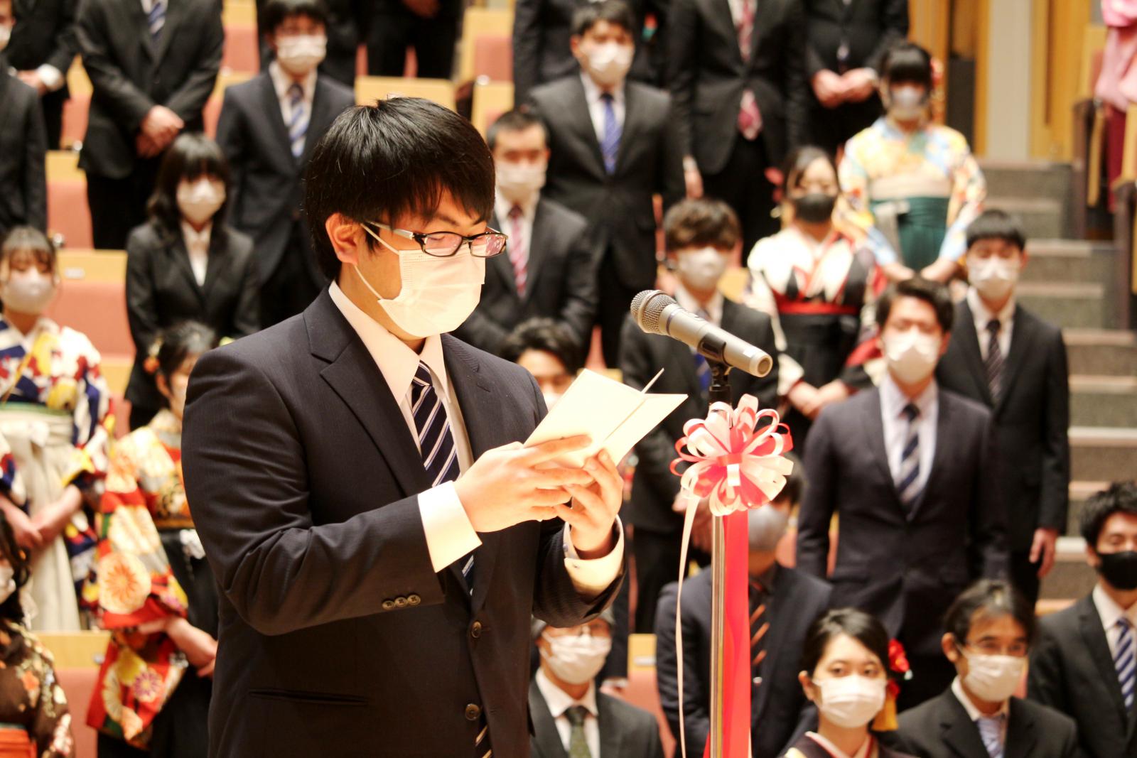 これに対し、生物資源科学部卒業生代表の大関 高広さんは、「納得いくまで実験を行い、疑問を解き明かす喜びを知り、そのときに感じた達成感は忘れることはありません。大学で経験したことを活かし、いかなる困難に対しても乗り越える努力をし、責任と自信を持って歩んでいきます」、システム科学技術学部卒業生代表の兼子 勇人さんは、「周りと切磋琢磨しながら課題や研究に取り組んでいくうちに、自分の考えに固執せず広い視野を持つことが大切だと気付きました。新たな環境では幾多の困難が待ち構えていると思いますが、大学で培ったたくさんの知識や多角的視点を駆使して乗り越えていきます」、と答辞のことばを述べました。