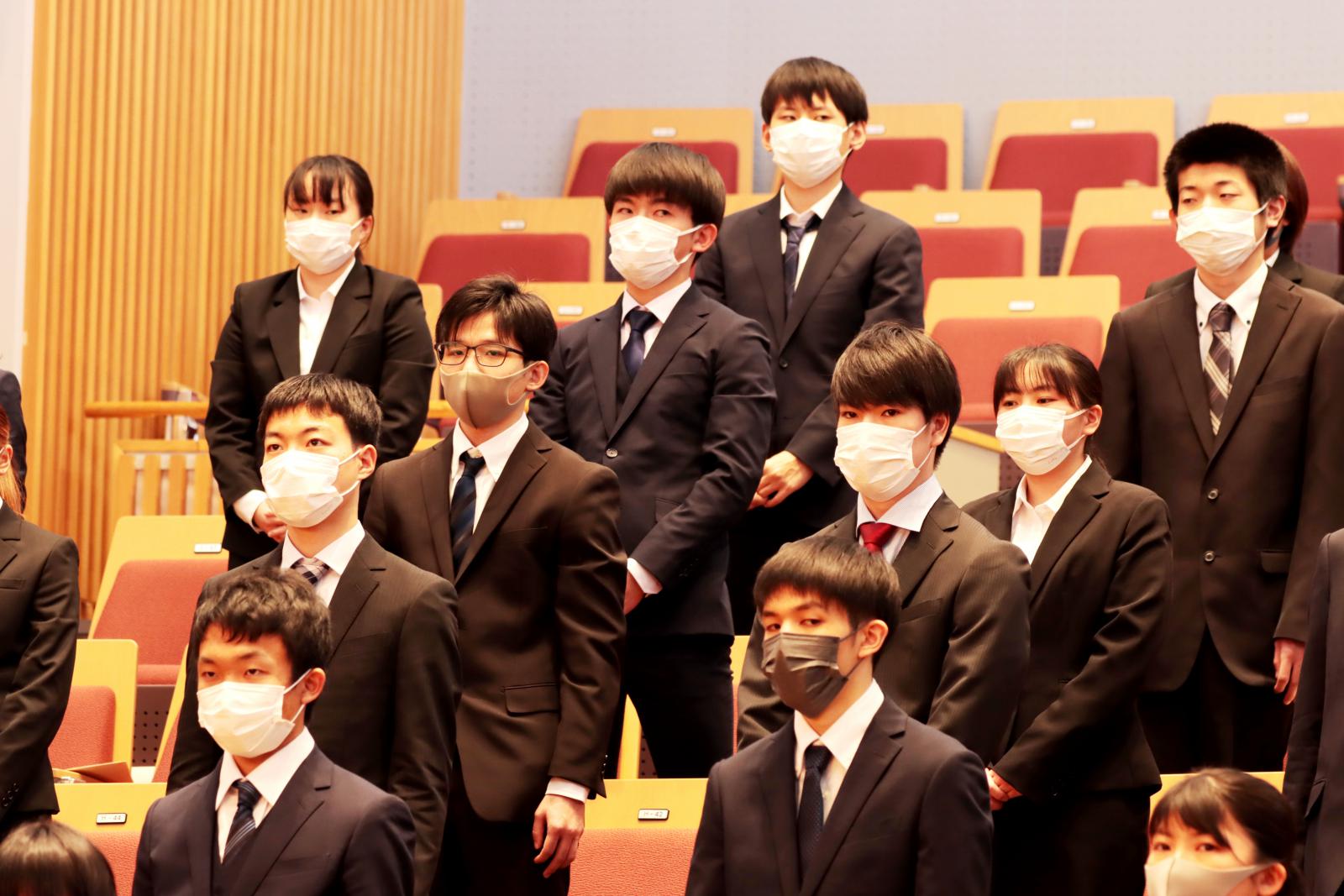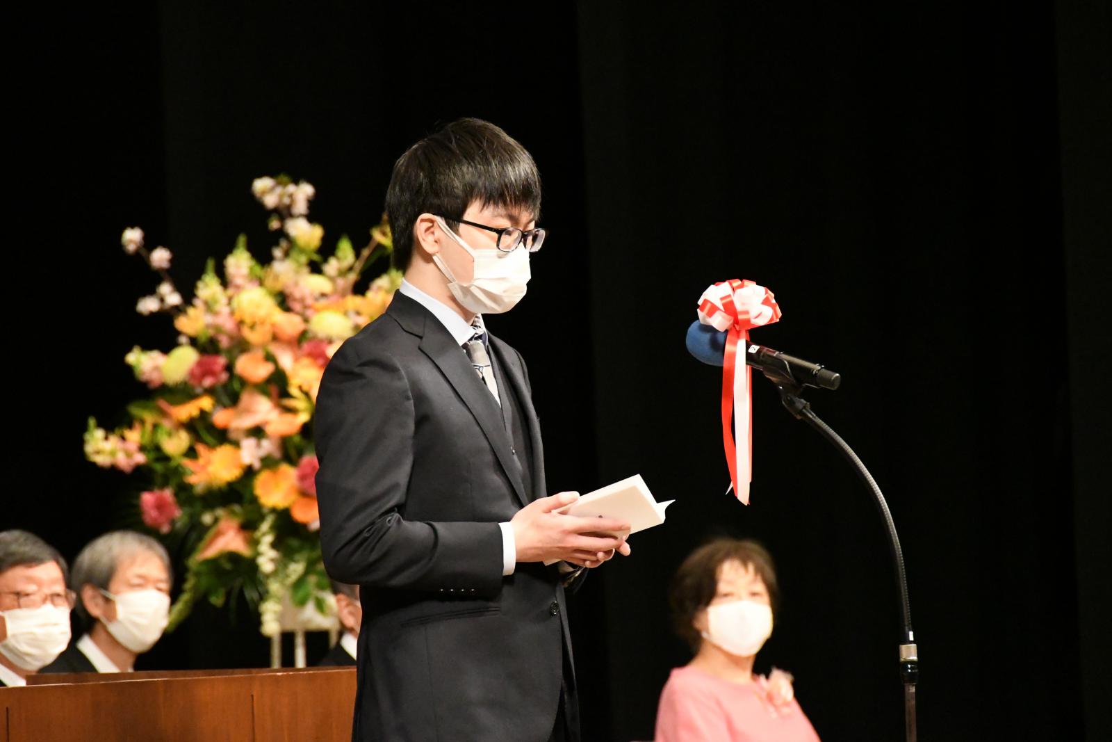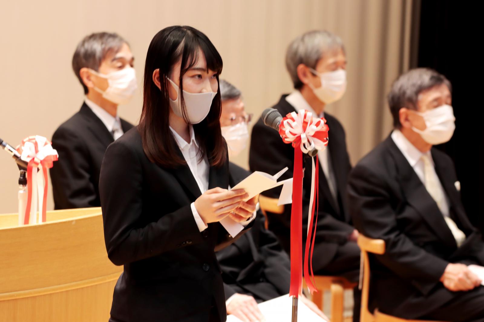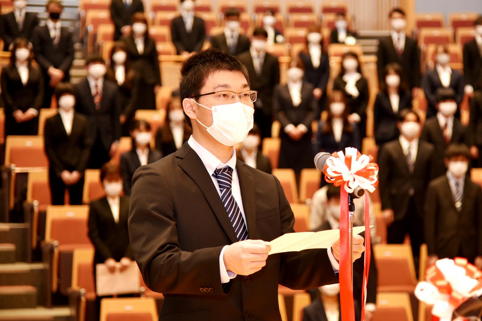 また新入生を代表して、生物資源科学部の三浦匠さん(秋田県/大曲高校出身)、システム科学技術学部の佐藤翔瑠さん(秋田県/横手清陵高校出身)は「常に未来の大きな目標を見据えて勉学に励み、自信と誇りを持って自らを向上させ、先輩たちとともに無限の可能性を切りひらいていきます」と力強く宣誓しました。