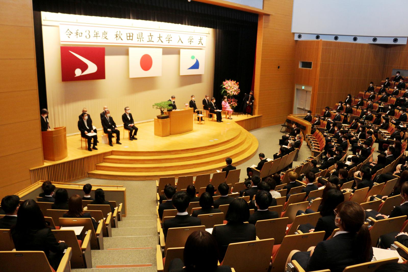 本学では昨年度の入学式は中止となりましたが、本年度は式典会場を学部・研究科ごとに、秋田キャンパスと由利本荘市文化交流館カダーレの2会場に分散し、式への参加対象を新入生に限定するなど、新型コロナウイルス感染症防止対策を講じながら挙行いたしました。