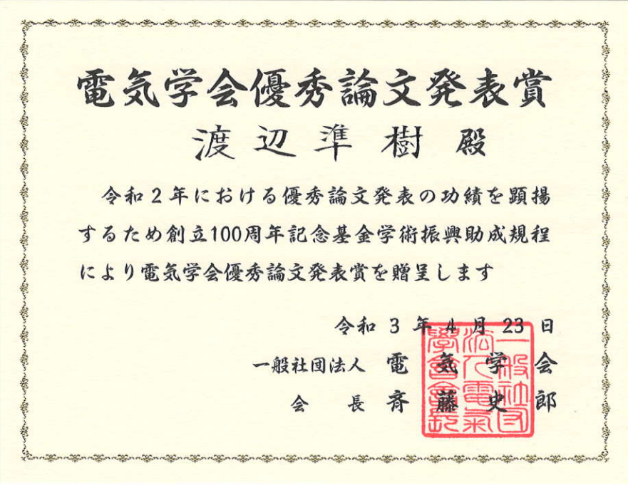 この度、システム科学技術学研究科博士前期課程電子情報システム学専攻2年生の渡辺準樹さんが、令和2年度電気関係学会東北支部連合大会において優秀論文発表賞(IEEJ Excellent Presentation Award)を受賞しました。【論文名】:中波ラジオ電波による環境電波発電に関する検討