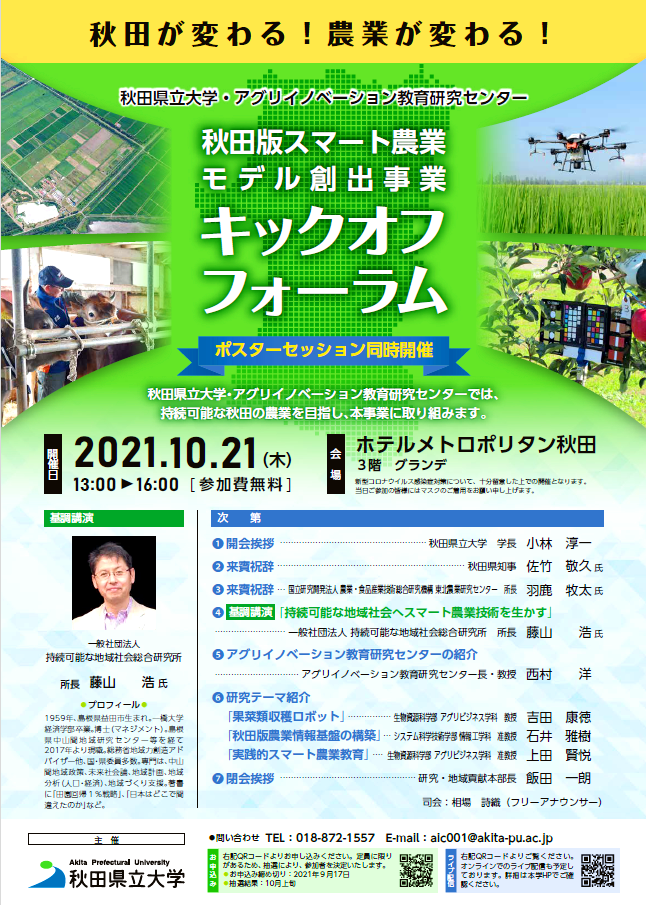 そこで、本学が推進する事業「秋田版スマート農業モデル創出事業」の内容を皆様に広く知っていただく機会としてキックオフフォーラムを開催する運びとなりました。