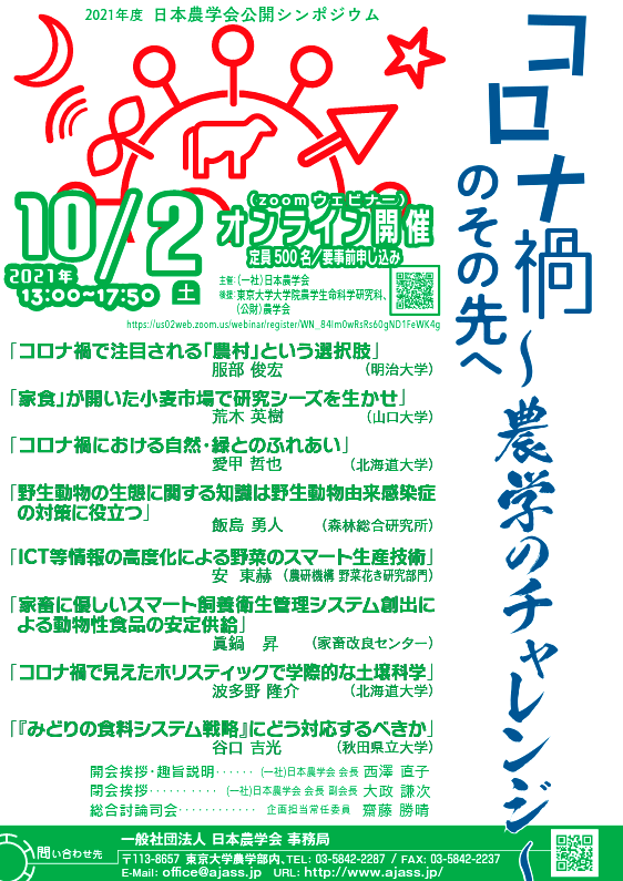 10月2日(土)、一般社団法人日本農学会が主催する公開シンポジウムにおいて、本学生物資源科学部の谷口吉光教授(生物環境科学科)が、「『みどりの食料システム戦略』にどう対応するべきか」と題して講演します。本シンポジウムは、「コロナ禍のその先へ~農学のチャレンジ~」というテーマで、新型コロナウイルス感染症の農林水産業への直接的な影響だけではなく、幅広い農学諸分野における影響や新たな研究ニーズの発掘も含めた対応・対策、あるいは新型コロナウイルス感染症対策への学術的貢献について議論します。ご興味ご関心のある方は、是非ご聴講ください。(参加無料・要参加申込)