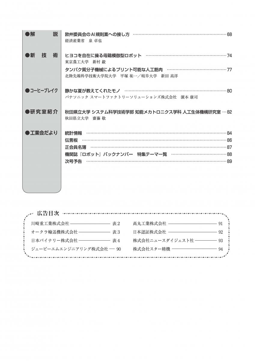 一般社団法人日本ロボット工業会の機関誌『ロボット』最新号に、知能メカトロニクス学科の人工生体機構研究室(齋藤敬准教授・ニックスステファニー助教)の研究室紹介記事が掲載されました。同会の会員企業はロボットに限らず様々な業界に渡っており、本学卒業生も多数働いています。齋藤敬准教授は、「この記事が本学の直近の活動を知る一助となれば幸いです。」とコメントしております