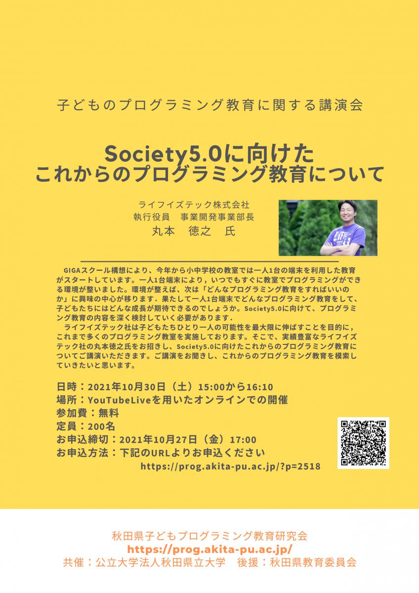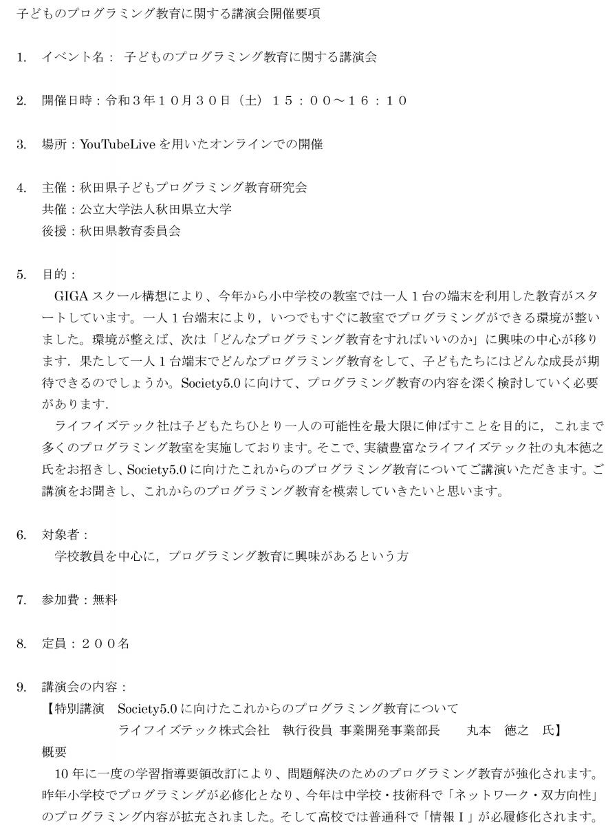 子どものプログラミング教育に関する講演会を開催いたします 令和3年10月30日に子どものプログラミング教育に関する講演会を開催いたします。 今年は、ライフイズテック社の丸本 徳之 氏をお迎えし、「Society5.0に向けたこれからのプログラミング教育」と題してご講演いただきます。 【お申し込み方法など詳しくはこちら】 講演会ポスター 講演会開催要項 (各々クリックすると、PDFデータを表示)
