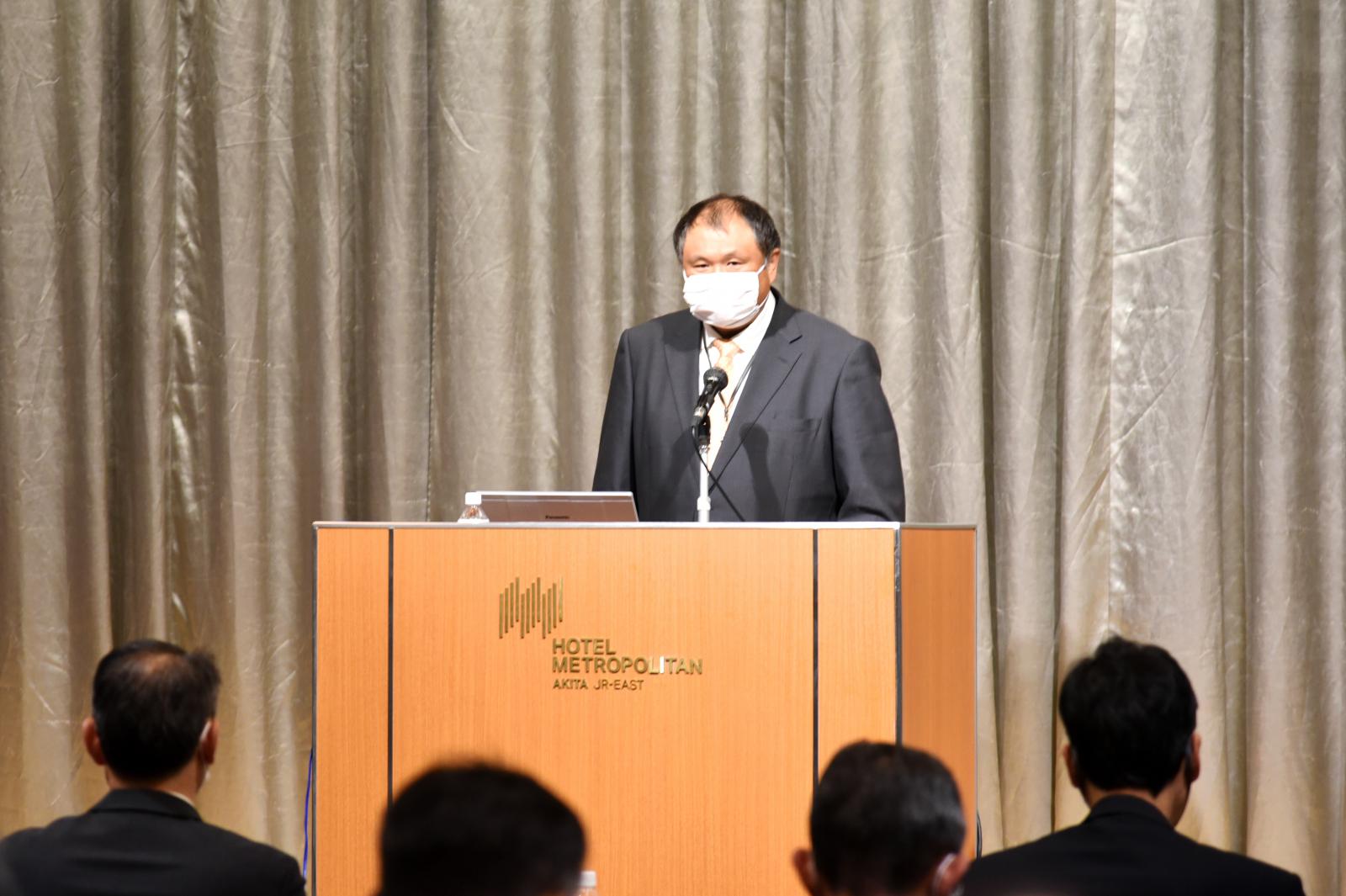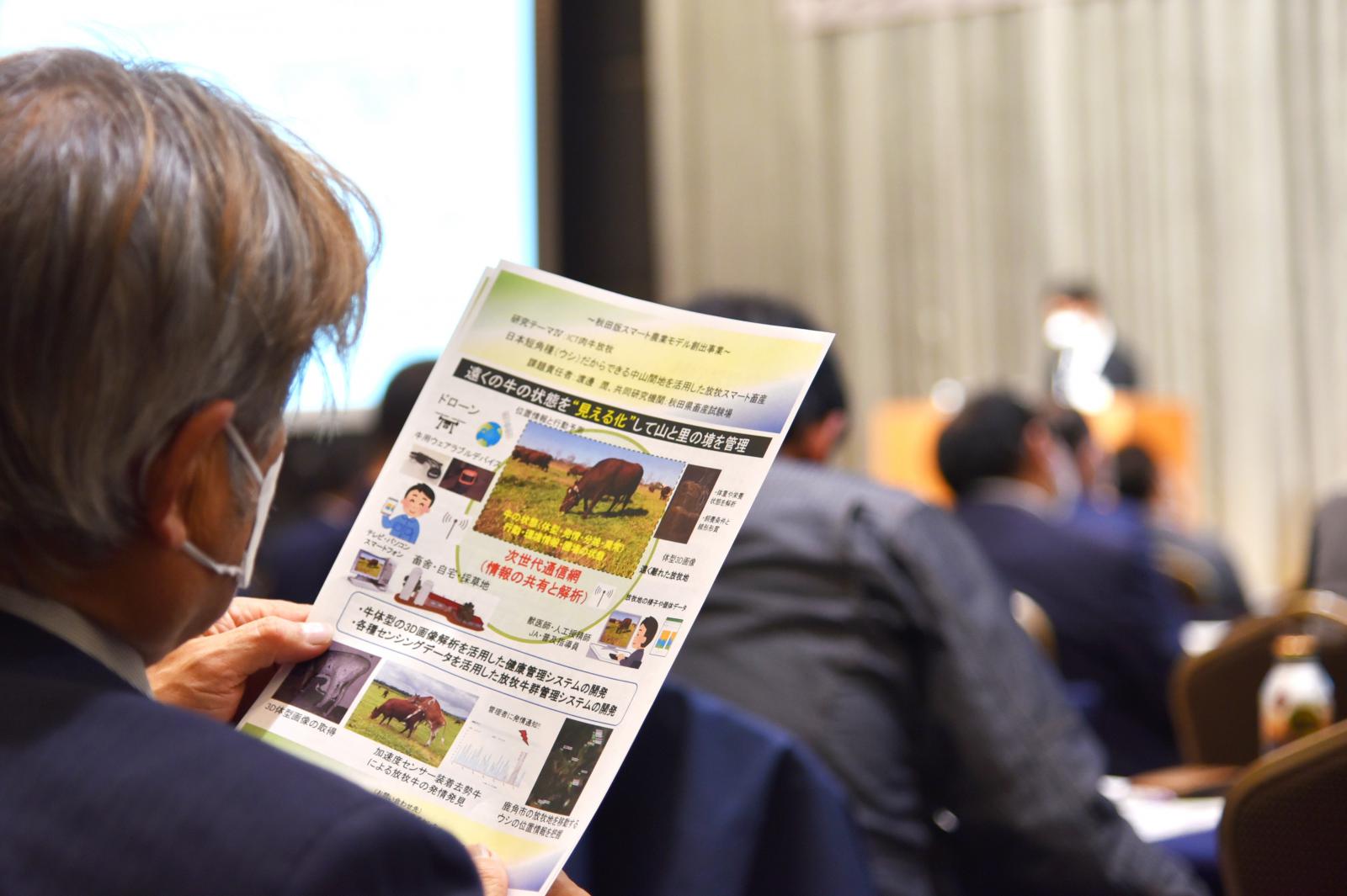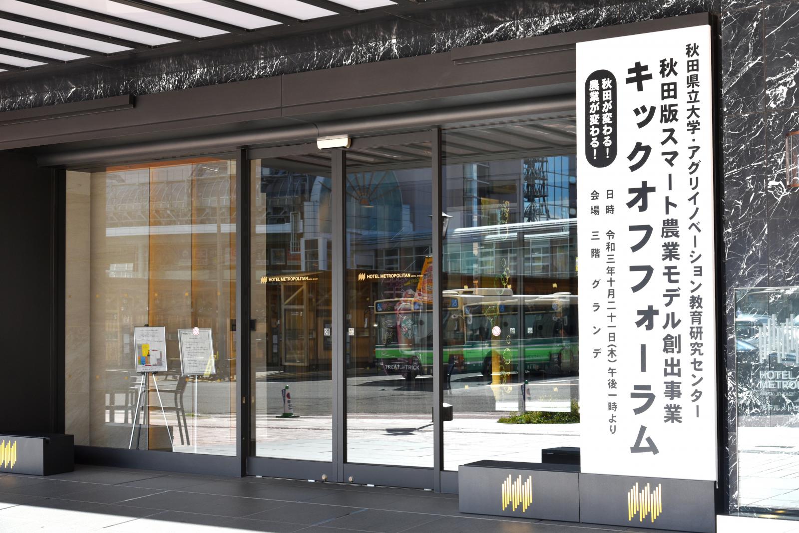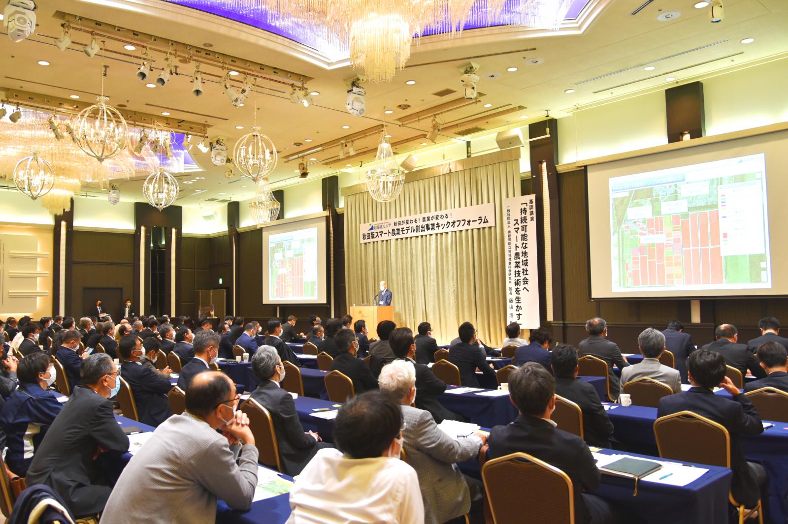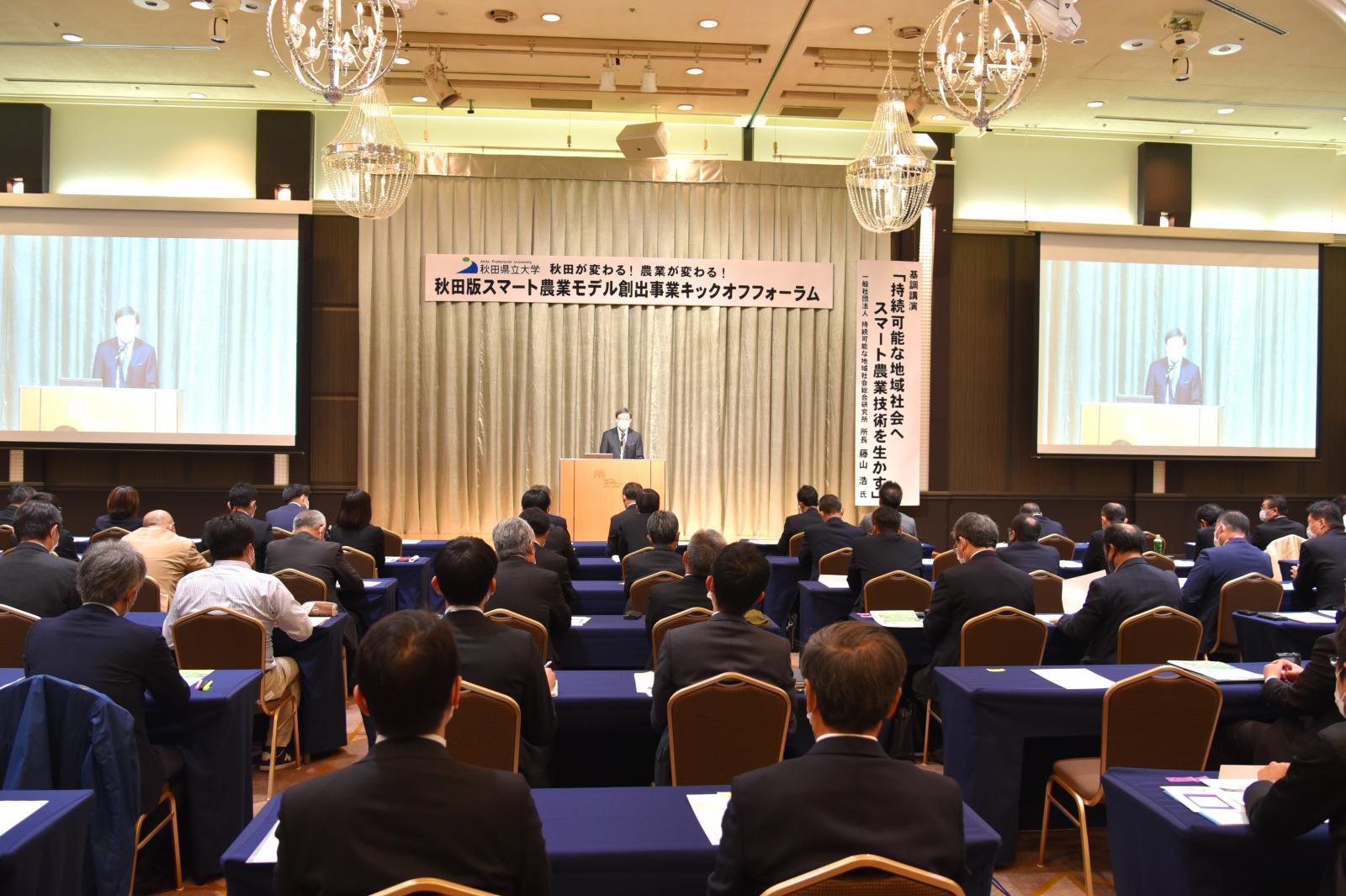 令和3年10月21日(木)、ホテルメトロポリタン秋田において、秋田が変わる!農業が変わる !「秋田版スマート農業モデル創出事業キックオフフォーラム」を開催しました。本フォーラムは、秋田県の農業を中心とした産業振興に貢献すべく、農学系と工学系の学部を有する本学の強みを生かして、令和3年4月に設置したアグリイノベーション教育研究センター(AIC)が推進する、『秋田版スマート農業モデル創出事業』を広く知っていただく機会として開催したものです。県内の農家さんや企業の関係者など多くの皆様とともに、「スマート農業」の導入による農家の担い手不足や高齢化などの課題を解決し、持続可能な秋田の農業の実現について考えました。