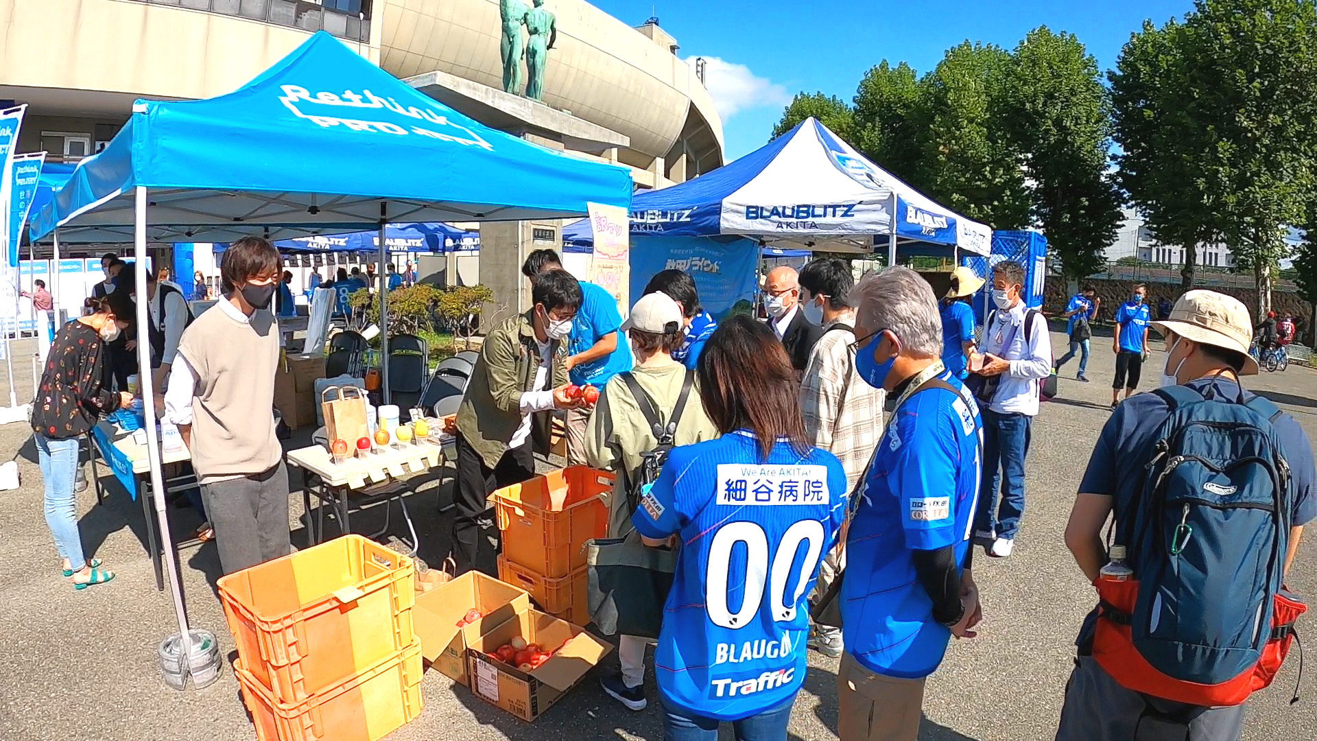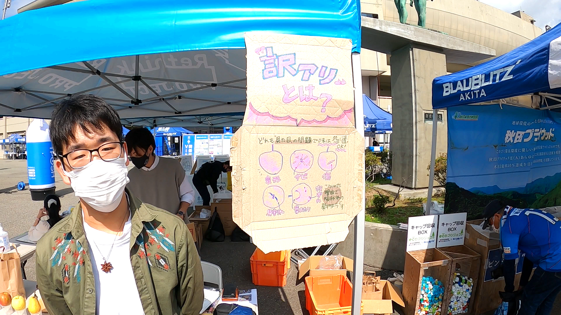 生物資源科学部生物生産科学科3年の伊東 幸親さんは、10月2日(土)、ブラウブリッツ秋田のホームゲーム(inソユースタジアム、VS愛媛FC)のイベントにおいて、傷が付いていたり、サイズや形に難があったりして、食べることができるのに廃棄される“規格外の果物”を格安で販売し果物の魅力を伝えました。販売した果物は、伊東さんが横手市の農家さんから譲り受けた規格外の洋梨やリンゴで、1個100円で販売しました。また、この日は、伊東さんの熱い想いに賛同した、応用生物科学科2年の種市 憲伸さんも一緒に活動しました。