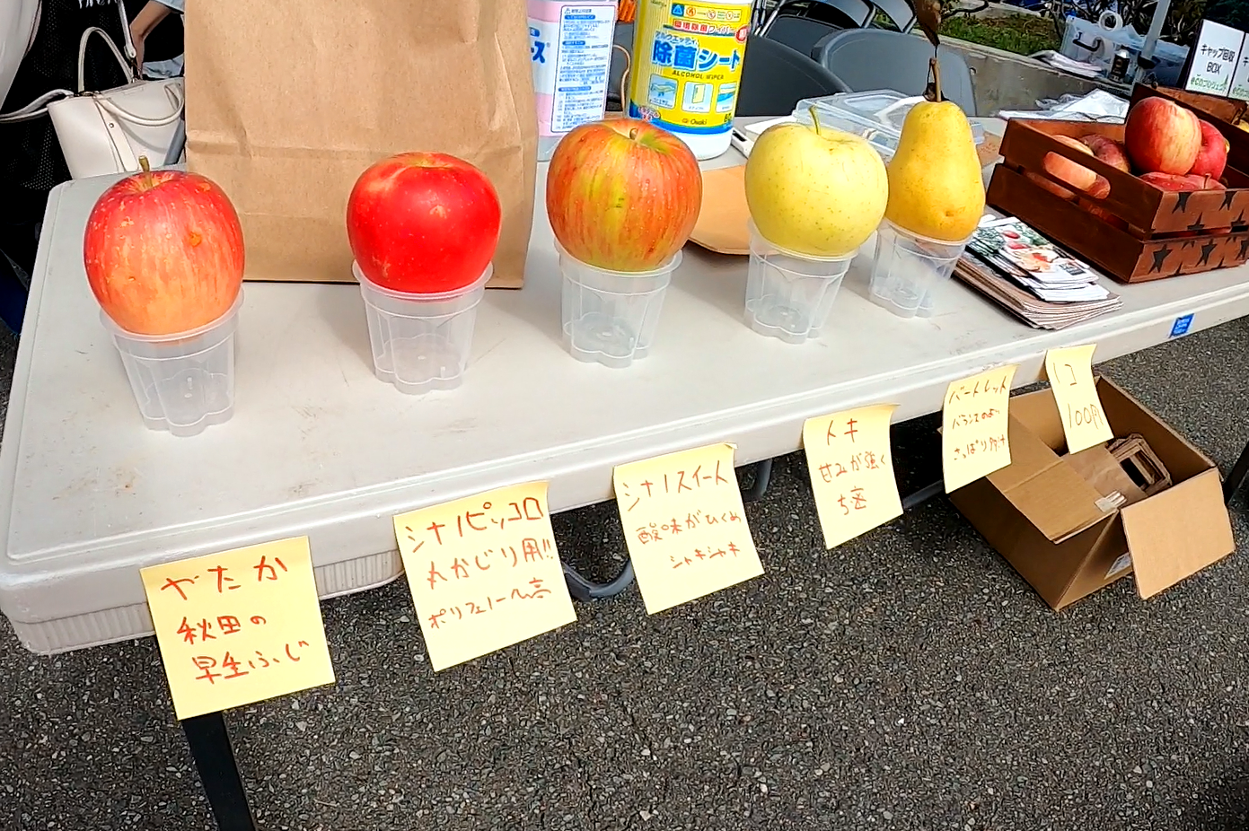また今回は、規格外果物の販売と同時に、ひとり親世帯の支援の一環として、NPO秋田たすけあいネットあゆむ、JT・日本たばこ産業が主催する「Rethink PROJECT」と連携し、サッカー観戦にきた子どもたちに、果物詰め合わせセットをプレゼントする活動も併せて行いました。