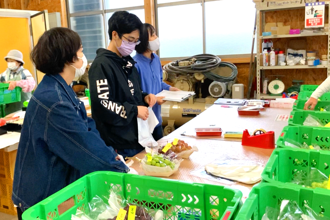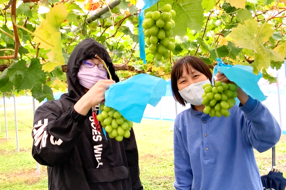 生物資源科学部 生物環境科学科(地域計画学研究室)の学生3名は、調査研究でお世話になっている、秋田県美郷町の農事組合法人TEAM.Freedomさんで、 ブドウの収穫と直売コーナーでの接客体験をさせていただきました。今回収穫したのは、あの高級品種「シャインマスカット」です!!これがホントの「シャイン研修」? 社員さんから詳しく解説を受けつつ収穫しました。そして箱詰めとお客様への対応についても勉強させていただきました。