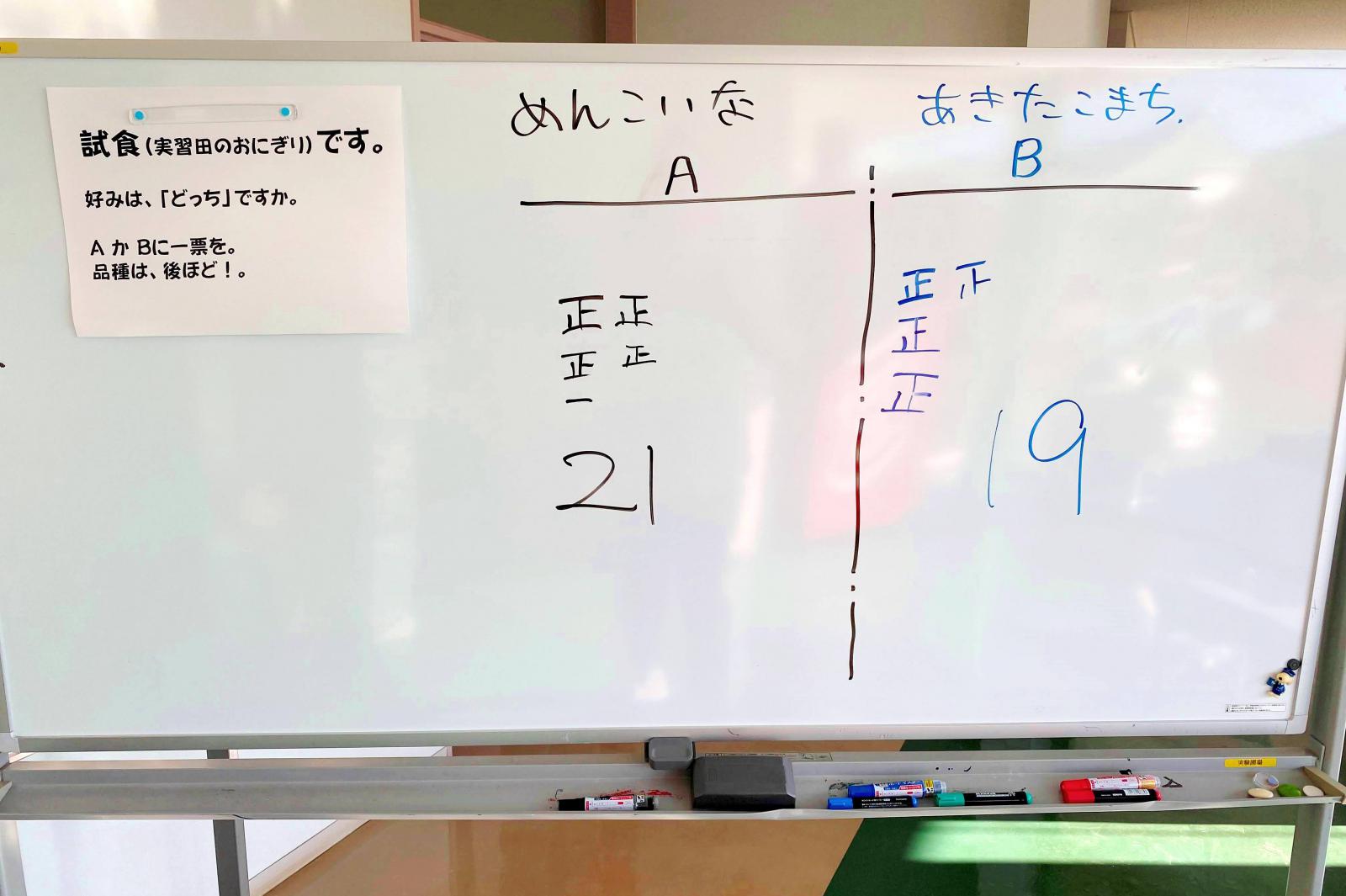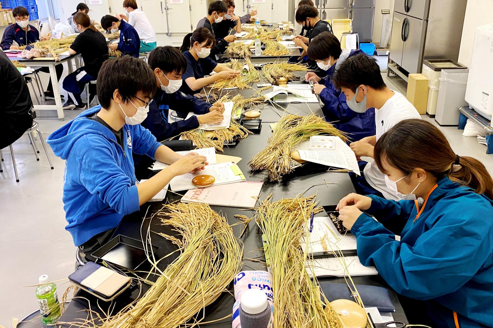 今後、穂数や籾数、登熟歩合などを一つ一つ測定して、10aあたりの収量を算出する方法と、一定区画(20株)を収穫して、10aあたりの収量を算出する方法により、各品種の収量を求めて収量の差を統計的に検定したり、収量に及ぼす要因について考察したりするなど、それぞれの測定方法の特徴を理解し、イネの育種過程での活用方法について理解を深めます。