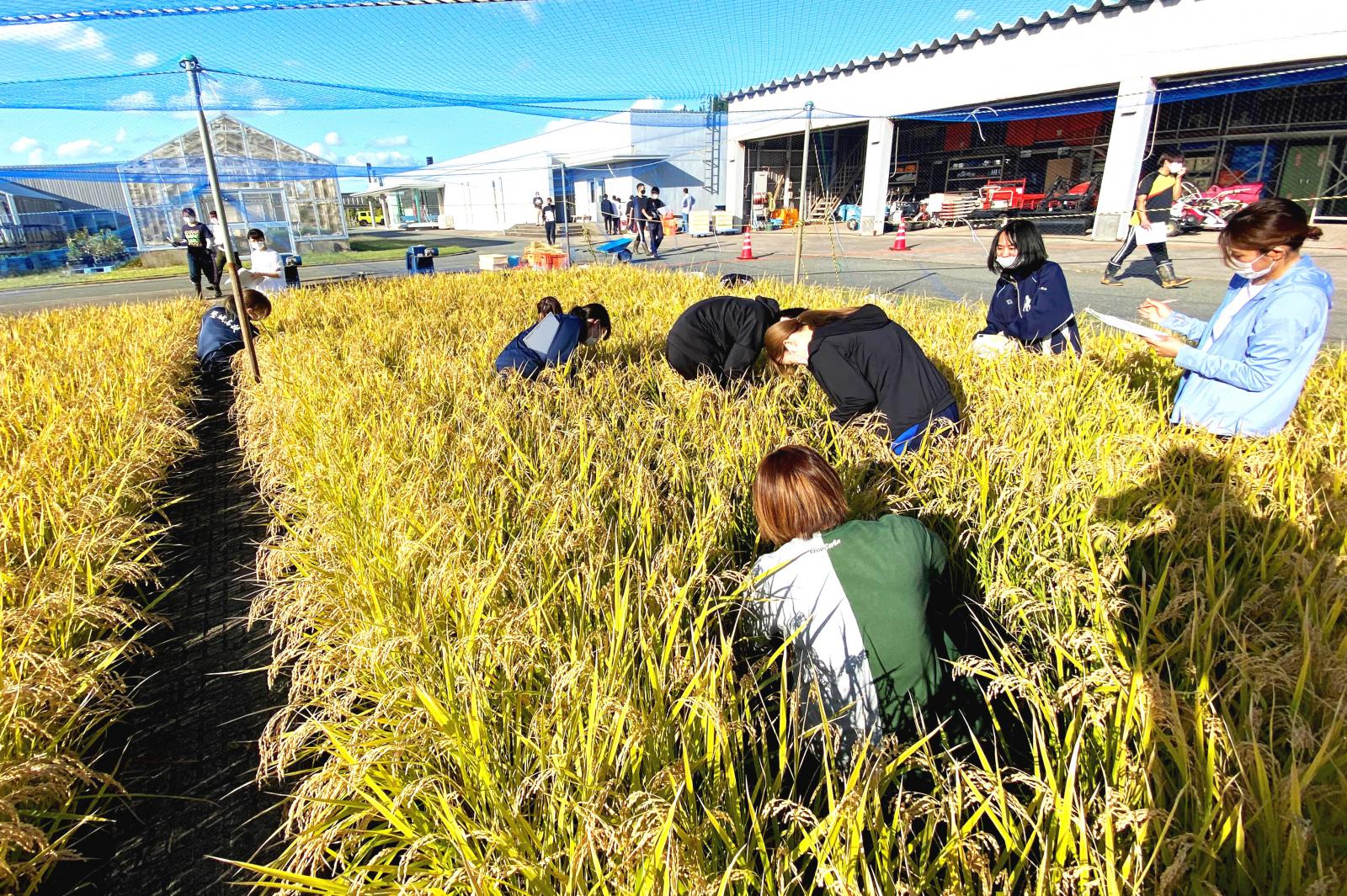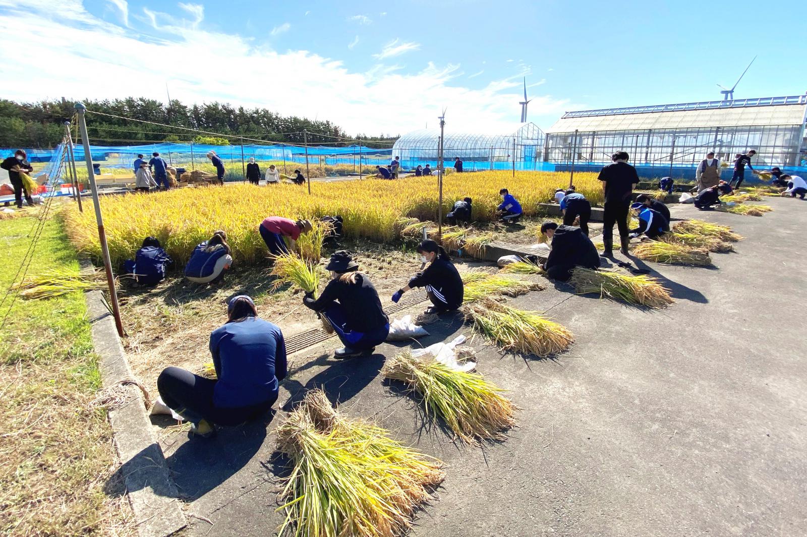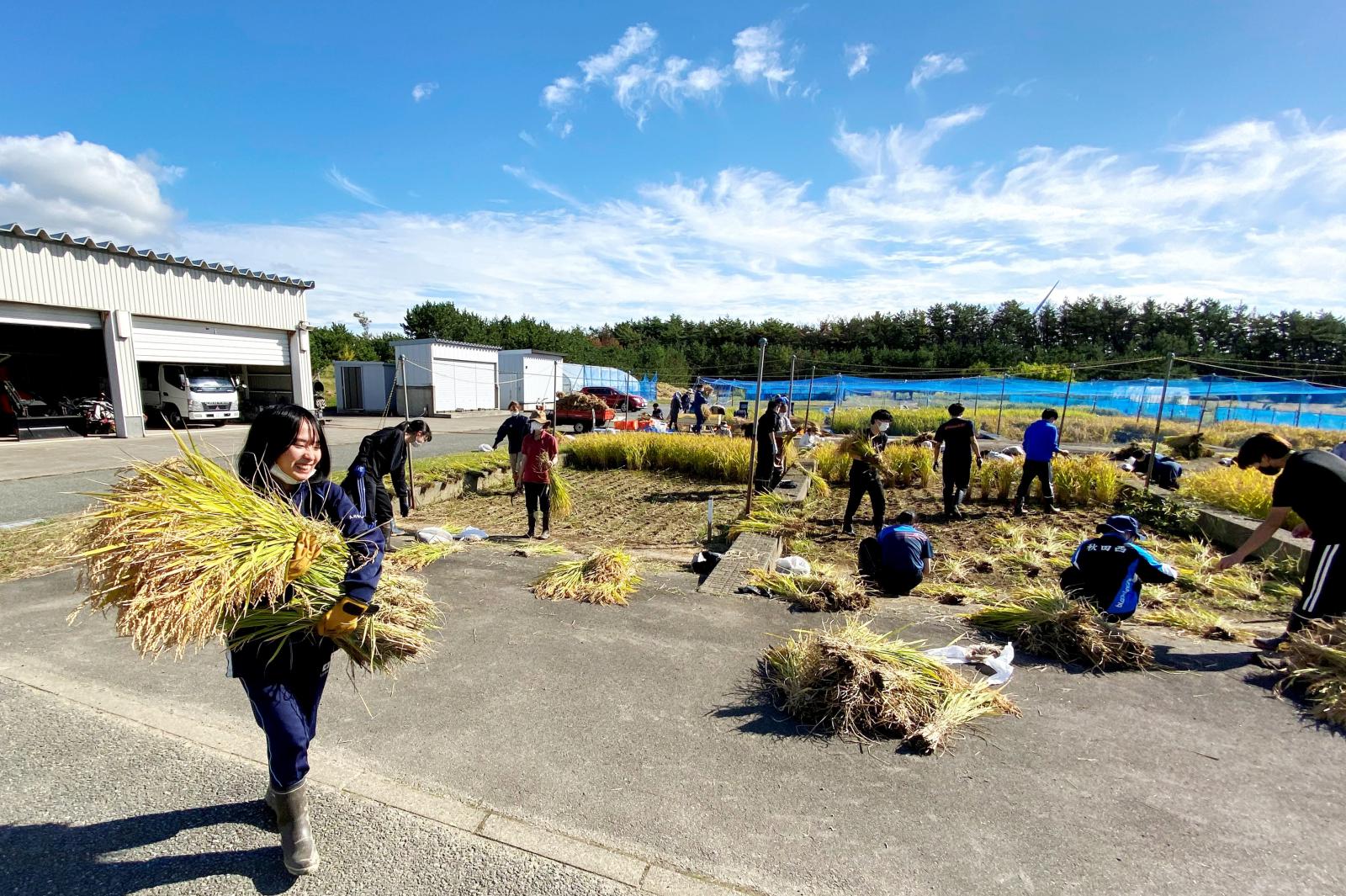 爽やかな秋晴れの中、秋田キャンパス実験圃場において、生物生産科学実験Ⅰ(生物生産科学科2年生)で、手刈りによる稲刈り実習が行われました。今回の実習は、前期授業「生物生産科学実習(Facebookにリンク)」の中で、播種から育苗など生育過程について学び、手植えにより田植え(公式Twitterにリンク)を行った、「あきたこまち」と「めんこいな」を手刈りにより収穫しました。