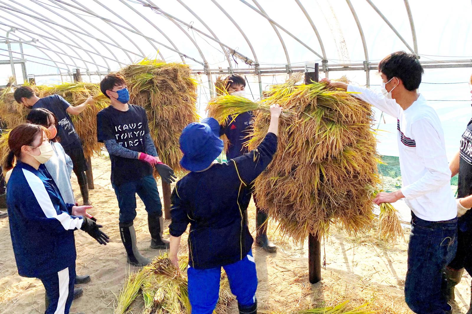 学生は、稲刈り鎌で手刈りしながら、稲の成長具合や手刈りの大変さも体感しながら楽しく収穫しました。また、刈り取った稲を天日干しする、“はさがけ”も体験しました。