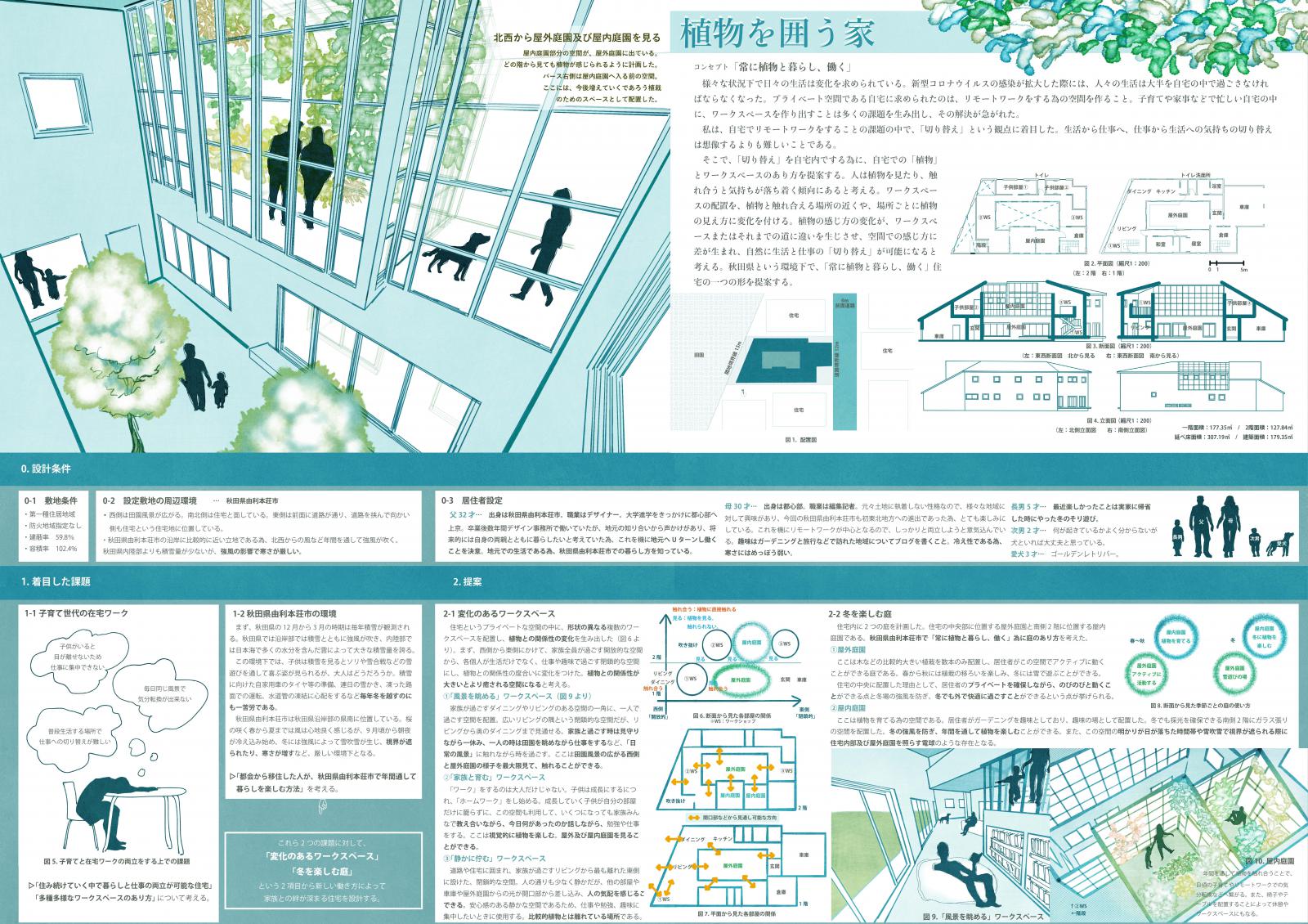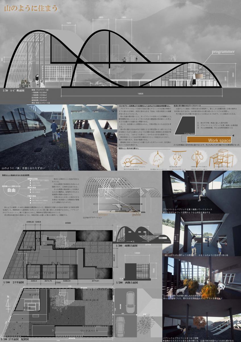 リモートワークが当たり前となりつつある今、自宅で仕事をすることの難しさが感じられたと思います。ワークスペースや植栽の配置に着目し、暮らしの中で自然に「切り替え」をする住宅を提案しました。今後も社会変化の中での住宅のあり方を考えていきたいと思います。(工藤)