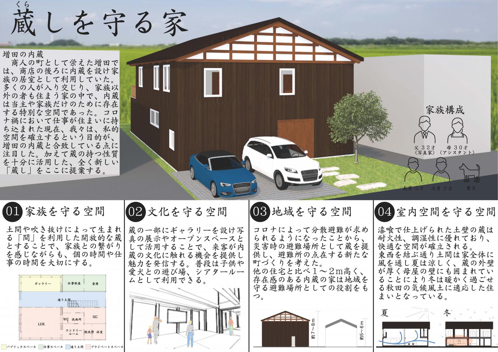 増田の内蔵を取り入れた新たな暮らしの提案を行うことができました。初めてのコンペへの挑戦でしたが,このような賞を受賞することができ光栄です。(坂田・菊地)
