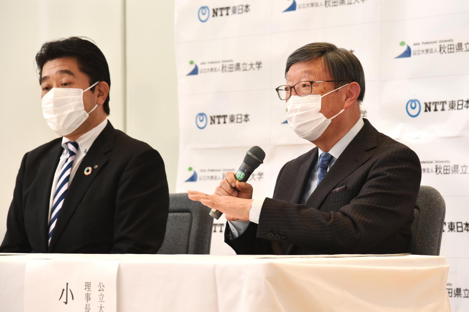 11月29日(月)、東日本電信電話株式会社秋田支店 (松浦 寛 支店長)と本学(小林 淳一 理事長)は、ICT技術を活用した地域産業の高度化に関する取り組み、主にスマート農業を活用した課題解決や、農業研究・人材育成を連携して取り組むことを目的に連携協定を締結しました。秋田県では農業従事者の高齢化や労働力不足・担い手不足が大きな課題となっており、農業の成長産業化を進めるためには、AIやIOTなどの ICT を活用したデータ駆動型の農業経営を実現し、消費者ニーズに的確に応える付加価値の高い農産物を提供していくことが求められています。