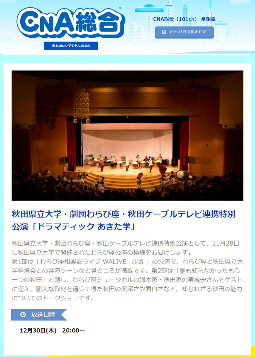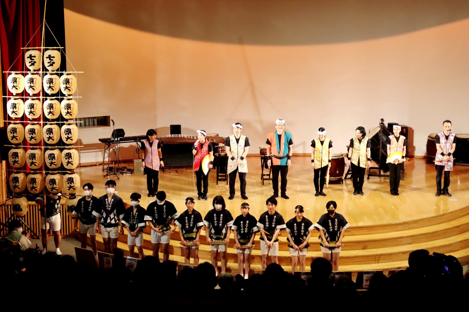 11月28日(日)、秋田キャンパス講堂において、秋田県立大学・劇団わらび座・秋田ケーブルテレビ連携特別公演『ドラマティックあきた学』を開催しました。本公演は、本学と包括連携協定を締結しております、劇団わらび座および秋田ケーブルテレビとの共同実施により、新型コロナウイルス感染症により窮屈な生活を強いられている県民の皆さまを、音楽や文化芸術で元気づけるため、今年初めて企画・開催したものです。当日は、5歳~96歳までの老若男女362人にご来場いただき、秋田をはじめ東北・北海道の祭りを題材にした和楽器による演奏パフォーマンスや竿燈の妙技をお楽しみいただきました。