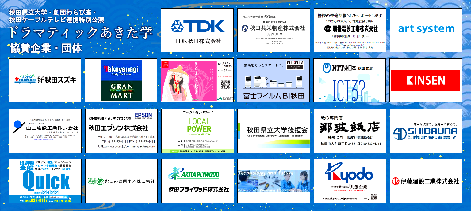 本公演を通して、秋田の価値や魅力を再発見するとともに、秋田で生きることの素晴らしさを少しでも感じていただけましたら幸いです。また、本公演には多くの企業・団体の皆様から多大な御支援をいただきました。この場を借りて厚く御礼を申し上げます。