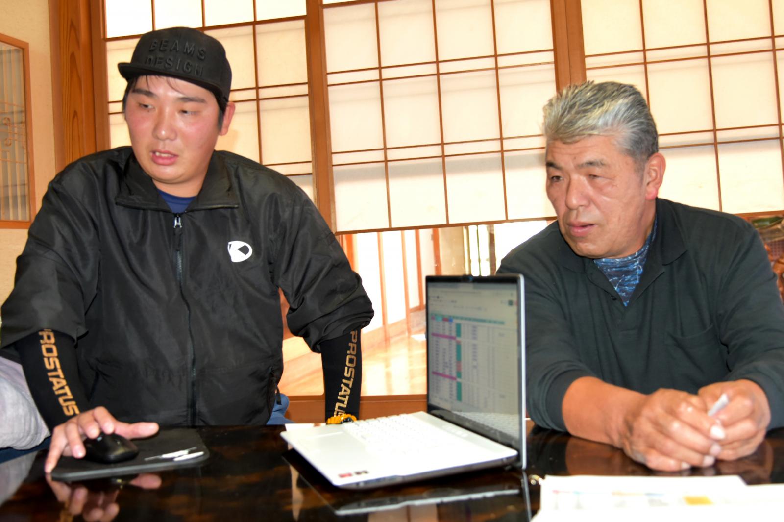 山内さんは、新規就農について潟上市職員に相談したところ、後継者がおらず事業承継者を探している佐々木祐逸さんを紹介され、面接と称した酒席で2人は意気投合し、山内さんは第三者継承を目指すことにしました。佐々木さんが所有する田んぼは約33ヘクタールで、離農者から引き受けた田んぼが広範囲に点在しております。山内さんは、大学での学びを活かし、農地集積マップを作成するとともに、使用した肥料の種類・量、雑草の成長度合い、稲の倒伏割合なども細かくデータ化し、緻密に営農プランを立て作業の効率化に取り組んでおります。