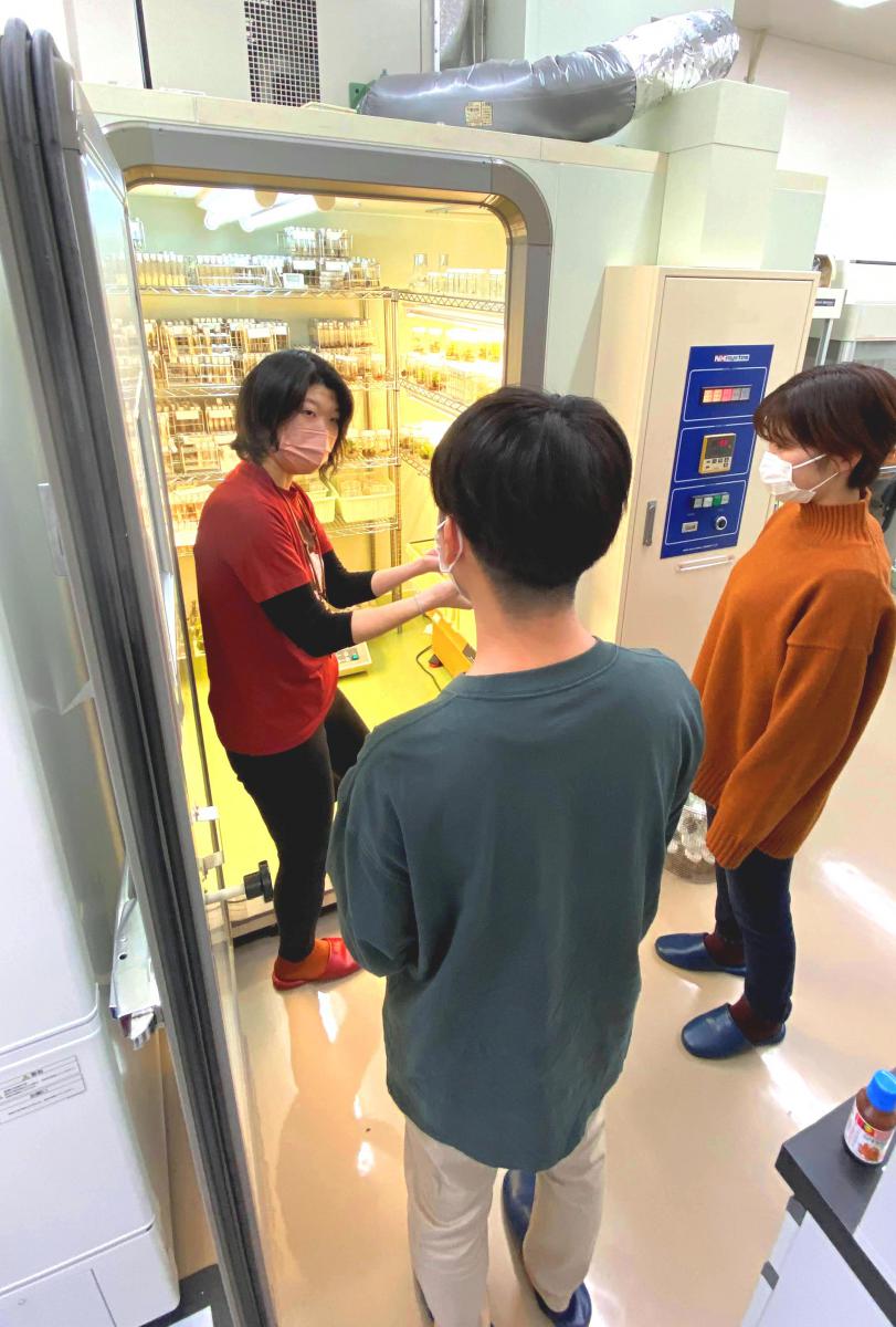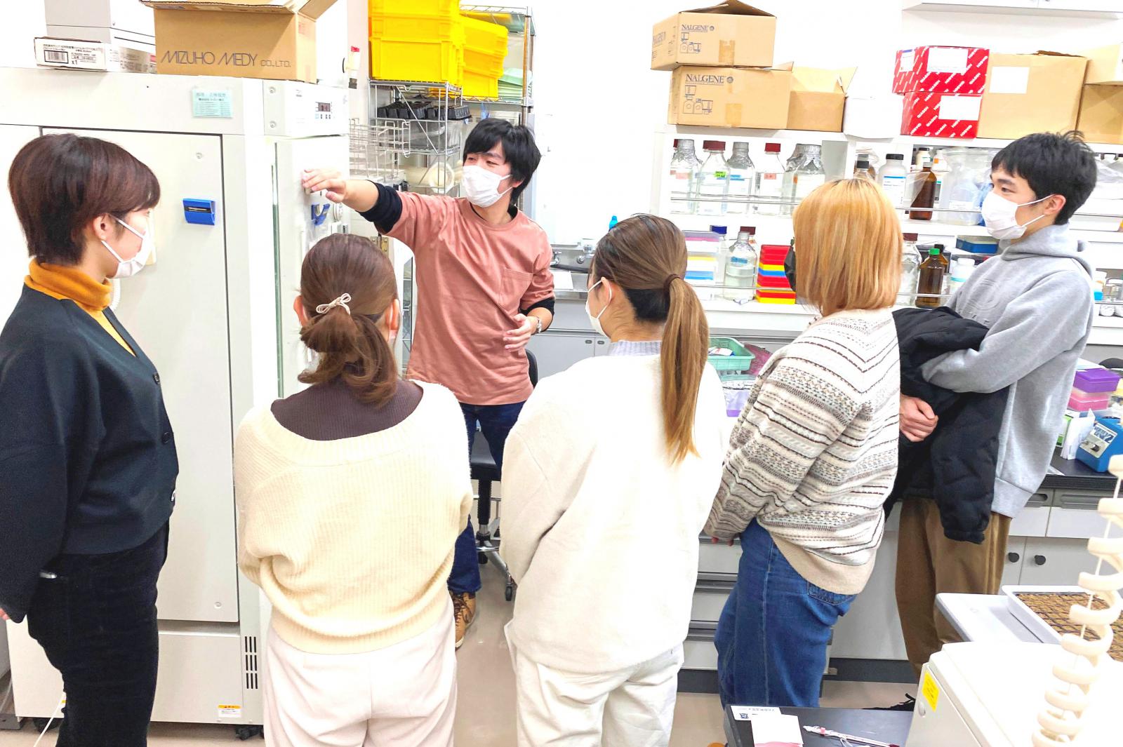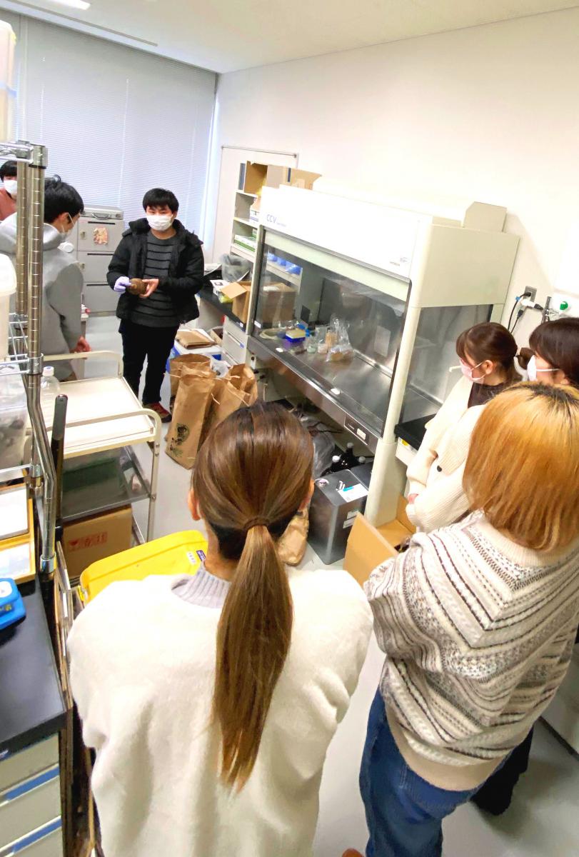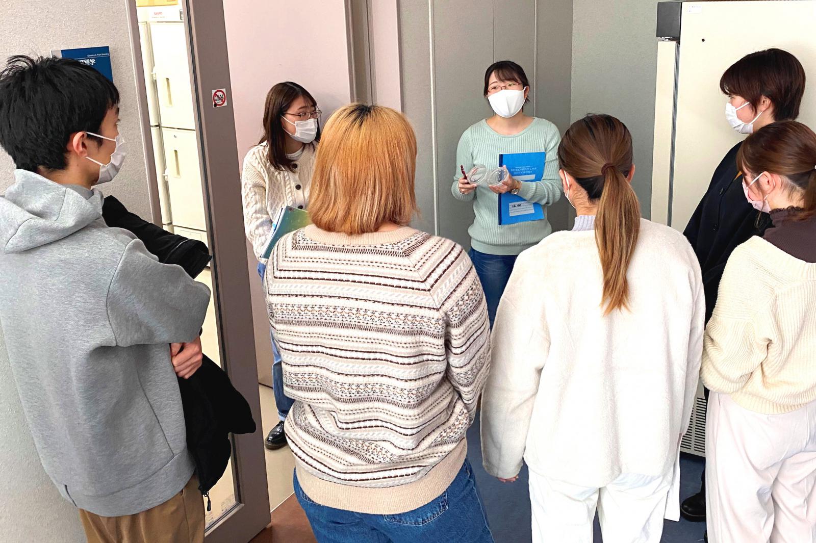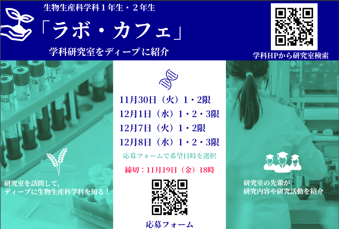 生物資源科学部では、3年生後期からそれぞれの研究室・プロジェクトに配属され、卒業研究を行います。この度、研究室配属前の1・2年生を対象に、研究室の紹介を行う「ラボ・カフェ」が開催されました。本企画は、研究室配属前の1・2年生を対象に、研究室の研究テーマや指導方針、雰囲気などについて早期の段階から理解を深め、配属後の円滑な研究活動に繋げることなどを目的に今年から開催しております。