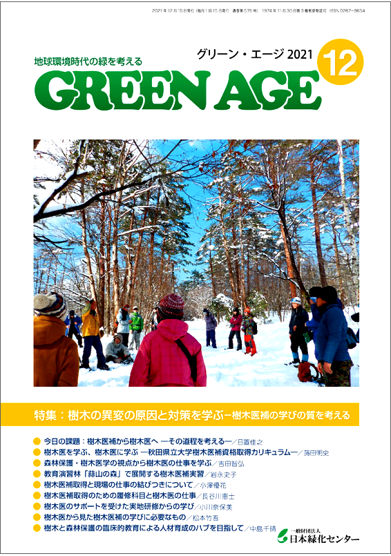 一般社団法人日本緑化センターが発行した、グリーン・エージ最新号(2021年12月号)の特集「樹木の異変の原因と対策を学ぶ ―樹木医補の学びの質を考える」に、本学生物資源科学部生物環境科学科の蒔田 明史 教授・学部長[専門:森林生態学]、および2017年度に生物環境科学科を卒業された小澤 優花さん(株式会社富士グリーンテック)の記事が掲載されました。『グリーン・エージ』は、地球環境問題、生物多様性、環境緑化、海岸林再生、マツ枯れ防除、樹木管理などのテーマを題材に、各分野の第一人者による理論や現場の実践事例を提供する、45年以上の歴史を有する“緑化”に関する総合情報誌です。