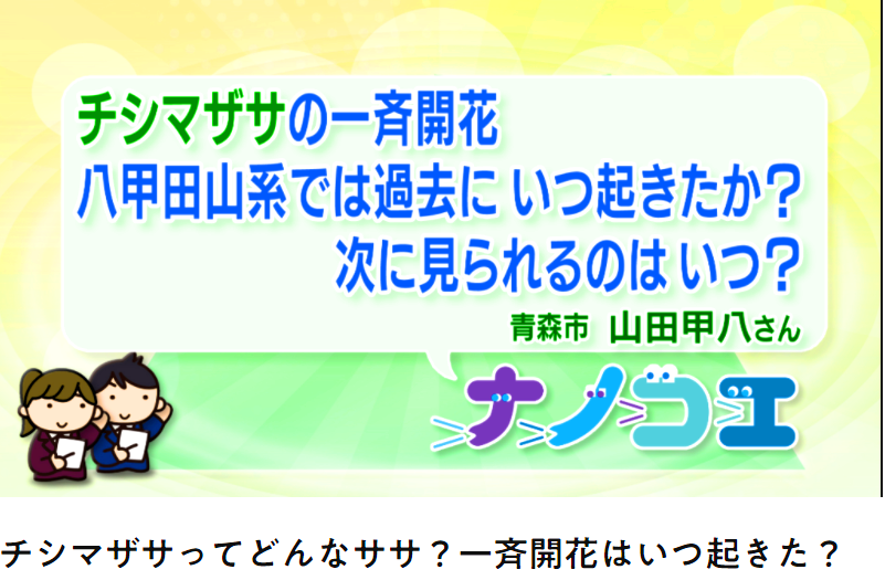 蒔田教授は、日常生活の疑問や困りごとに答える「ナノコエ(※)」というコーナーの中で、「チシマザサってどんなササ?一斉開花はいつ起きた?」という市民からの質問に対し、ササの不思議な生態についてエピソードを交えながら解説しております。