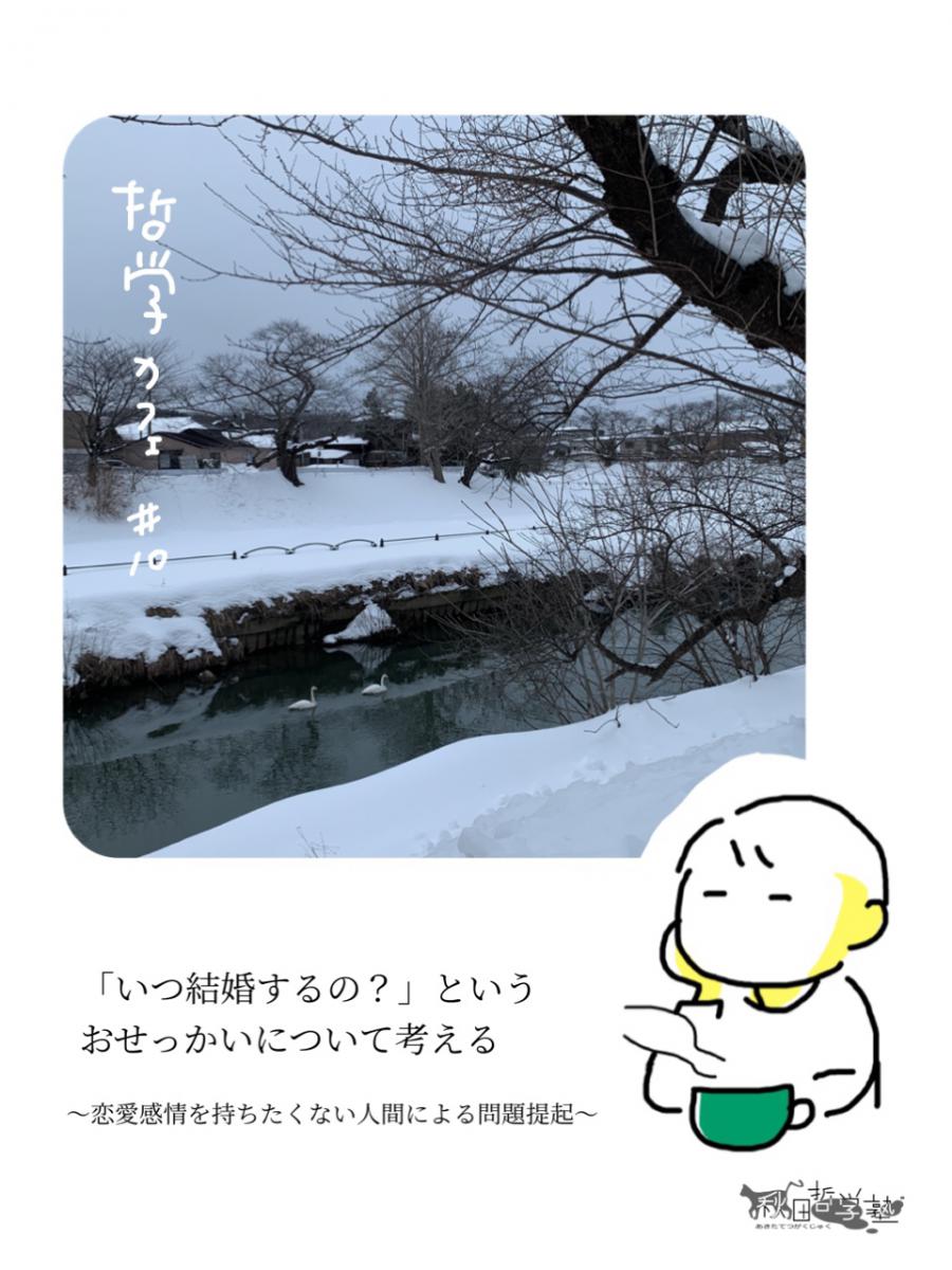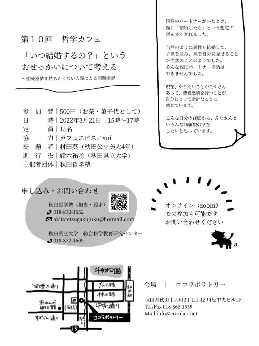 本学総合科学教育研究センターでは、哲学を通じた地域貢献活動として、「秋田哲学塾(代表:総合科学教育研究センター 鈴木 祐丞 助教)」を主催しております。その一環として、3月21日(月・祝)、『「いつ結婚するの?」というおせっかいについて考える――恋愛感情を持ちたくない人間による問題提起――』をテーマに、秋田市大町のココラボラトリーにおいて、第10回哲学カフェを開催いたします。