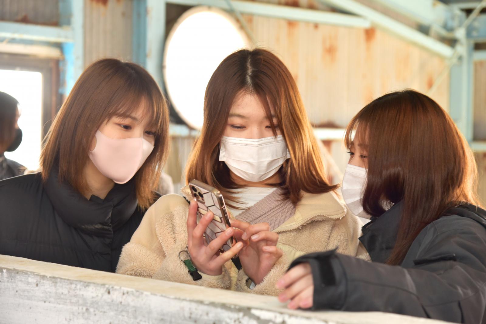 可愛い子牛を写真に収める学生たち