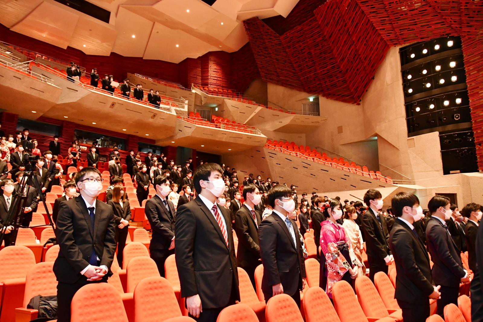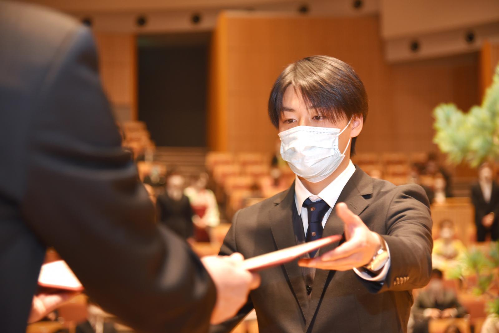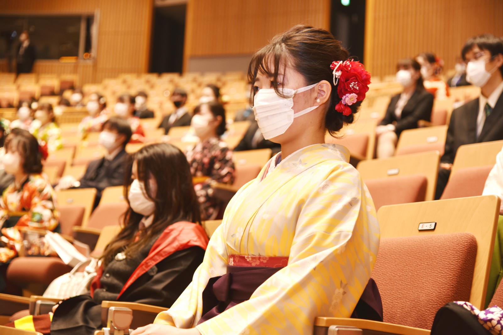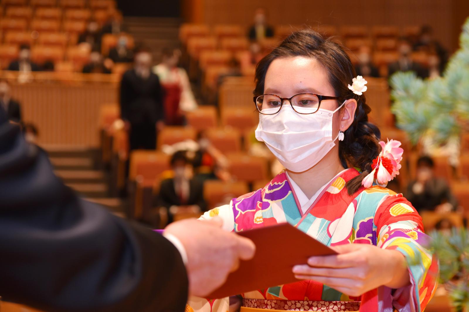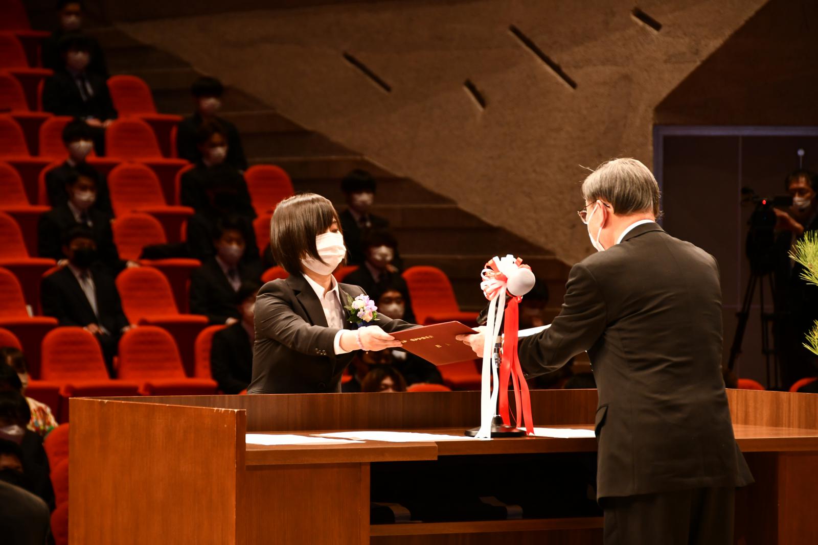 本学では、昨年度に引き続き、式典会場を学部・研究科ごとに2会場に分散し、式への参加対象を卒業生・修了生のみに限定するなど、新型コロナウイルス感染症防止対策を講じながら挙行いたしました。式では、学生の代表が小林淳一学長から学位記や修了証書を受け取りました。