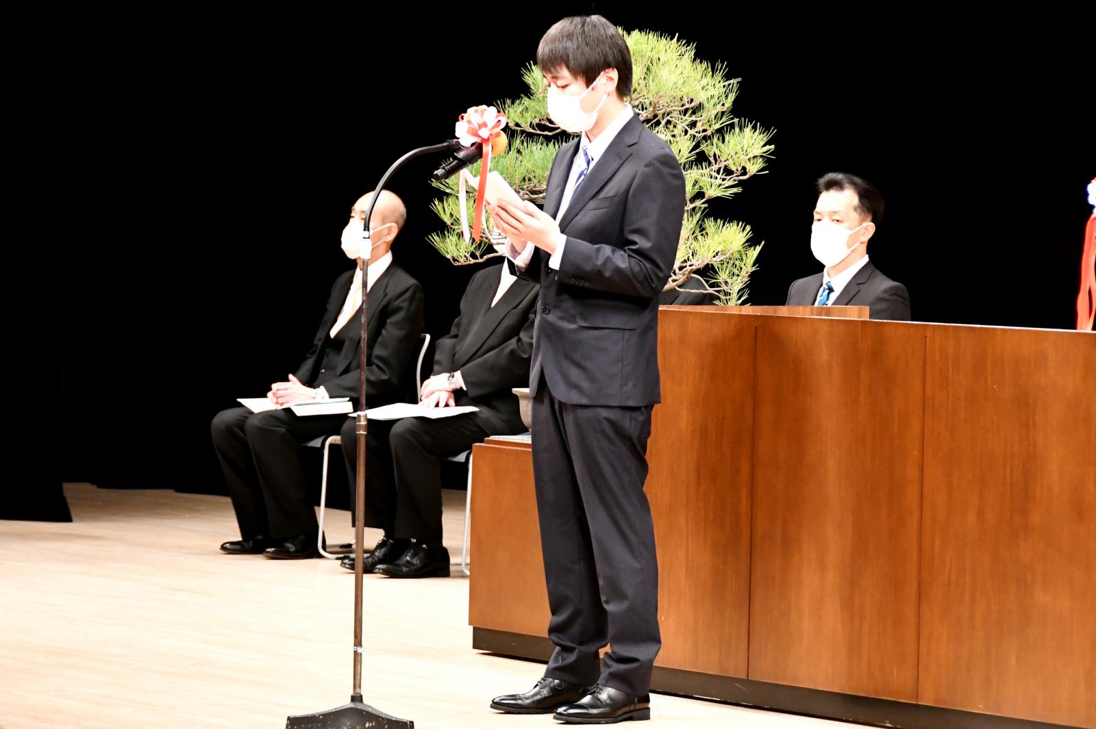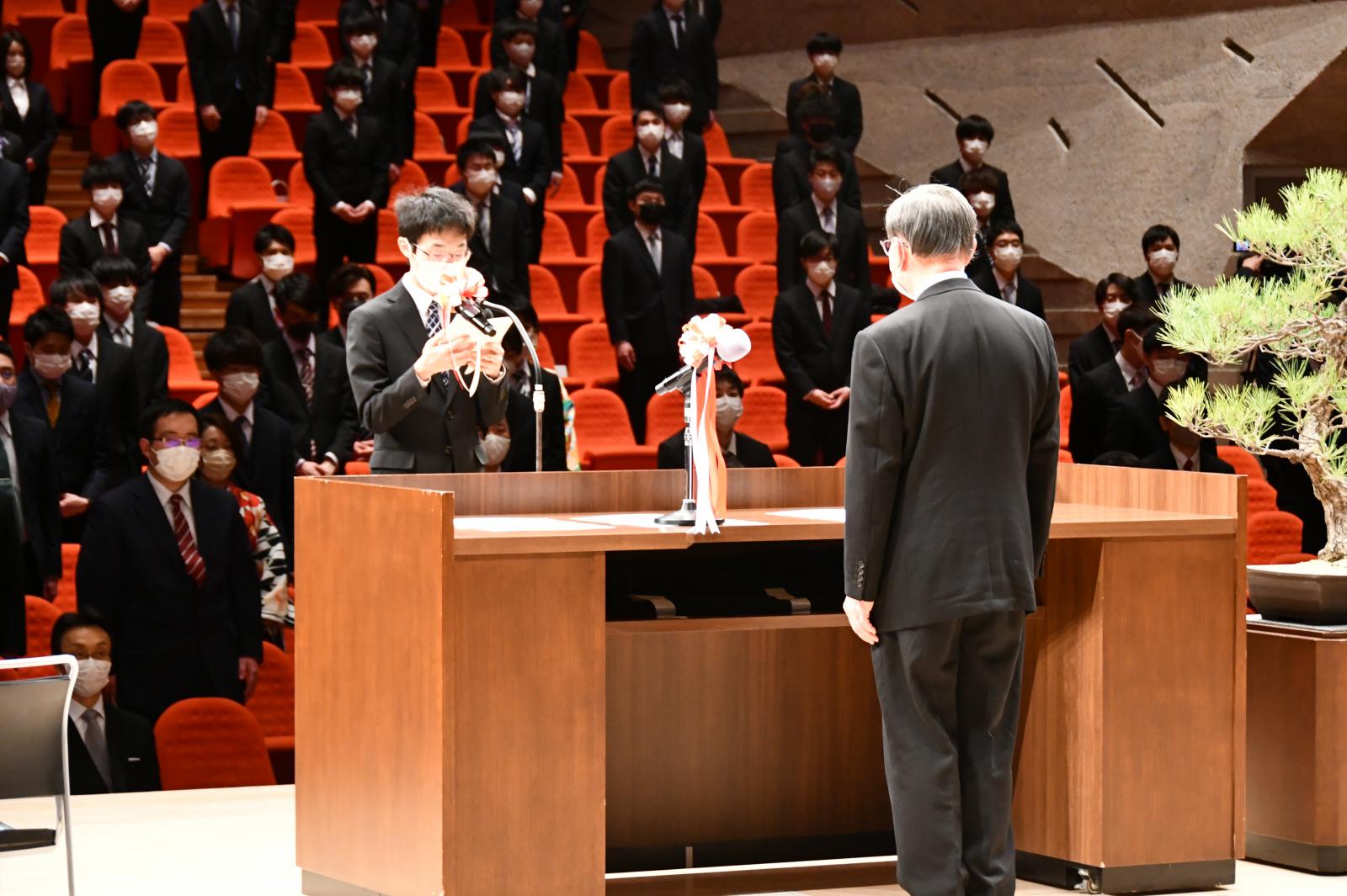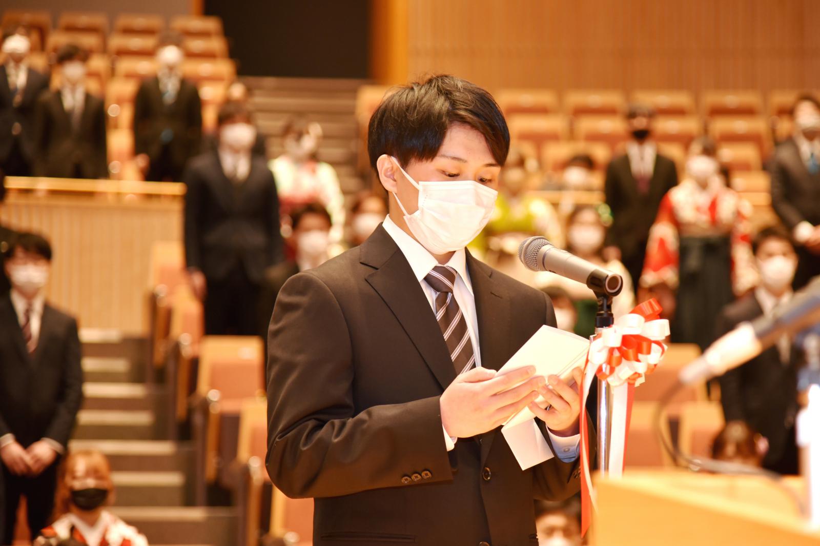 これに対し、生物資源科学部卒業生代表の千葉 優吏さんは、「納得いくまで実験を行い、疑問を解き明かす喜びを知り、そのときに感じた達成感は忘れることはありません。大学で経験したことを活かし、いかなる困難に対しても乗り越える努力をし、責任を持って社会に貢献できるよう努力を重ねていきます」、システム科学技術学部卒業生代表の遠藤 良洸さんは、「周りと切磋琢磨しながら課題や研究に取り組んでいくうちに、自分の考えに固執せず広い視野を持つことが大切だと気付きました。新たな環境では幾多の困難が待ち構えていると思いますが、大学で培ったたくさんの知識や多角的視点を駆使して乗り越えていきます」、と答辞のことばを述べました。