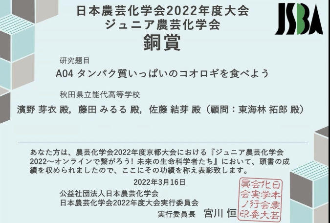 令和4年3月16日にオンライン形式で行われた、日本農芸化学会が主催する「ジュニア農芸化学会2022」において、本学生物資源科学部および木材高度加工研究所が研究を支援した、秋田県立能代高校の2年生3名の研究グループ(顧問:東海林拓郎先生、本学2期生)の研究成果が、ブロンズアワード(銅賞:第3位)を受賞しました‼おめでとうございます。【研究テーマ】