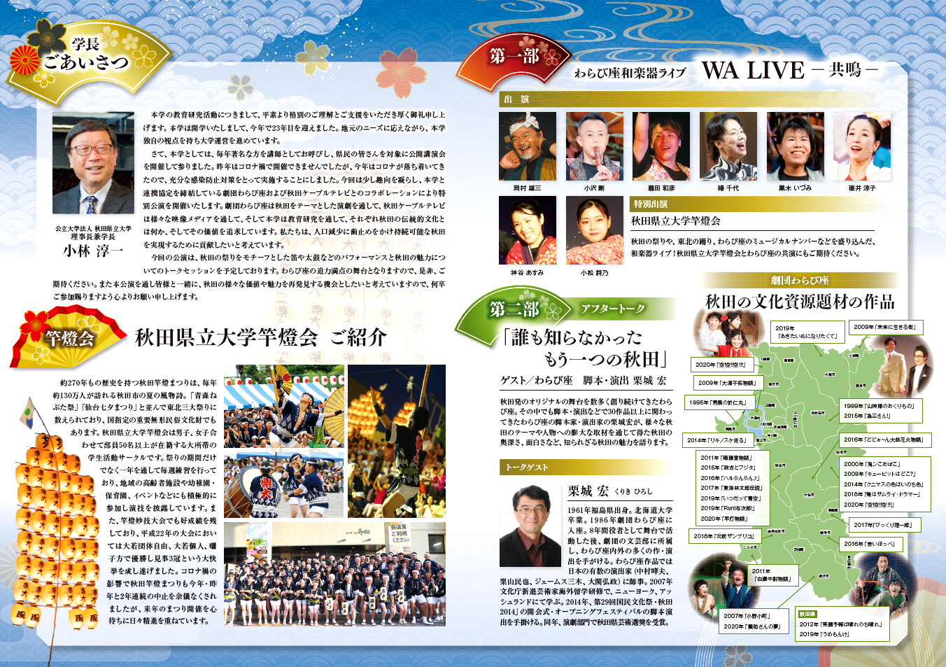 秋田県立大学・劇団わらび座・秋田ケーブルテレビ連携特別公演『ドラマティック あきた学』は成功裏に終えることができました。本公演を通して、秋田の価値や魅力を再発見するとともに、秋田で生きることの素晴らしさを感じていただけましたら幸いです。また、本公演には多くの企業・団体の皆様から多大な御支援をいただきました。心から御礼を申し上げます。本公演の模様は、12月30日(木)午後8時~、秋田ケーブルテレビにて放映されます。